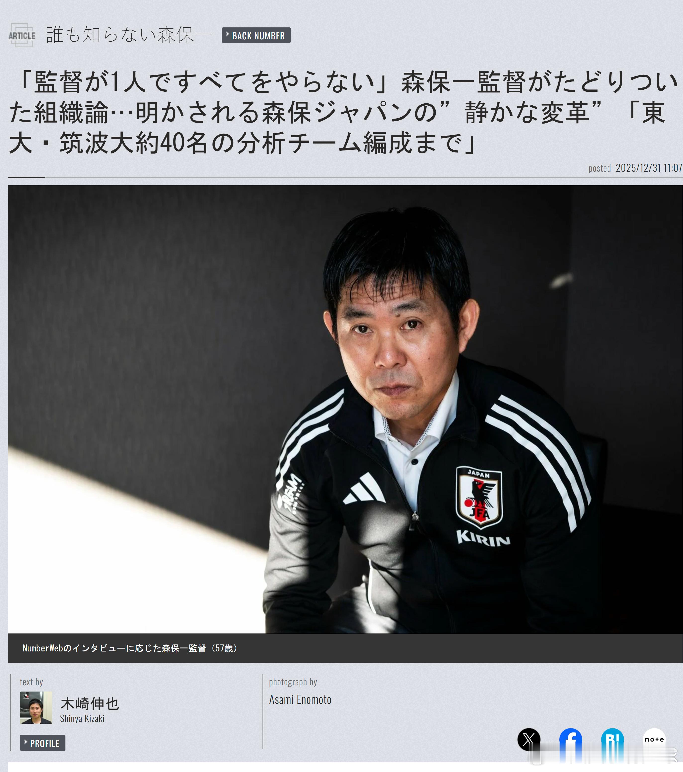 【NUMBER采访 | 第六篇:“主教练不一人独揽一切”——森保一摸索出的组织论……揭秘森保日本队的“悄然变革”,包括“东大·筑波大约40人分析团队的组建”】日本国家队主教练森保一是一位偏好“悄然变革”的指挥官。在2022年卡塔尔世界杯预选赛对阵澳大利亚的比赛中,他曾进行过切换到4-3-3阵型的根本性改革,但此类情况较为罕见。他基本原则是避免让外部人士察觉,而是通过内部逐步培养共识,悄然且稳步推进球队变革。例如,在卡塔尔世界杯首战对阵德国队的下半场,他切换到三后卫阵型,让许多人感到惊讶,但在那之前,他在多场热身赛的尾声阶段经常测试三后卫阵型。对于森保而言,那相当于模拟演练。在世界杯备战过程中,他会避免让对手察觉,精心布置战术。他是一位天生的胜负师。【主教练不一人独揽一切】这似乎也适用于工作人员管理。面向2026年世界杯,日本队正在逐步推行新举措,已逐步发展成一个功能多元化的集体。本文将深入探讨森保鲜为人知的工作人员管理之道。首先,作为前提知识,让我们回顾一下森保日本队教练组的角色分工。从2022年卡塔尔世界杯预选赛中期开始,森保逐步向教练分配权限,从而形成了横内昭展教练负责进攻、齊藤俊秀教练负责防守、上野優作教练负责定位球进攻、门将教练下田崇负责定位球防守的体制。在卡塔尔世界杯后的第二期执教中,这一模式进一步演进,森保公开宣称自己是“管理型主教练”。由于横内和上野转战J联赛,新任教练名波浩负责进攻,前田遼一负责定位球进攻。随后,2024年8月,长谷部诚加入教练组。森保这样阐述角色分工的意图:“这一切都是为了提高取胜概率。相比主教练一人负责进攻、防守、定位球进攻和定位球防守四个方面,由专人负责能更广泛、更深入地收集信息。主教练一人包办肯定不如分工协作质量高。特别是国家队,大多在赛前2、3天集结就直接比赛。俱乐部球队有3、4周的集训营,并能全年持续优化,但国家队无法做到。此外,在约10天的国家队活动期内,还有公关活动、与医疗团队协调等非执教任务众多。我认为让各负责人深入钻研,再由他们亲自向球员传达,能让内容更深入渗透。”【新职位“定位球分析专员”】此外,森保还新设了多个职位。例如,新引入“定位球专责分析官”。日本国家队有寺門大輔、中下征樹、若林大智、渡邉秀朗四位技术人员(分析官)。其中,最年轻的渡邉被任命为“定位球分析专员”。“无论世界杯预选赛还是热身赛,国家队窗口期通常有两场比赛。我们以往的体制是寺門和若林各负责分析一个对手国家。向球员的演示也由他们负责。中下和渡邉则负责整体技术支持。此外,中下负责着眼世界杯淘汰赛,分析潜在对手国家,并规划如何在淘汰赛中发挥自身实力。而渡邉则负责定位球分析。他分析对手的定位球特点,并向教练组传达趋势和对策。”前田教练与渡邉分析官的搭档协作,使定位球已成为日本国家队的一大武器。2025年10月对阵巴拉圭的比赛中,同点进球源于任意球攻势,随后对阵巴西的上田綺世制胜球则来自角球。不仅有诱导对手视线的假动作,还有封堵对手创造空间的联动配合,都运转良好。“在渡邉的支持下,遼一(前田教练)深入思考如何做好准备以求结果。他的热情也传达到了球员们。定位球的选择确实增加了。在定位球进攻方面,名波教练的贡献也很大。遼一会向名波教练征求意见,名波教练会给出极佳建议。另一方面,在定位球防守上,齊藤教练和下田教练会沟通协作,思考最佳方案。”要让工作人员角色分工有效运转,沟通是最关键要素。如果各自只顾自身领域,陷入派系主义,组织就会四分五裂。但在森保日本队,这点无需担心。因为教练们频繁进行讨论。“划分进攻担当和防守担当后,转换环节可能出现断层,但名波教练)和齊藤教练沟通非常顺畅。他们会确认‘从防守转为进攻时该怎么做’之类。日本要在世界舞台取胜,转换环节至关重要。包括谁如何向球员演示,他们都会边确认边推进。我每天都感受到他们的出色。”【“向名波教练、齊藤教练询问‘你怎么想?’”】比赛中,日本国家队替补席的固定座位顺序是森保、名波、齊藤。电视画面常捕捉到森保与名波商量的场景。但据森保透露,进攻相关咨询时找名波,防守相关时找齊藤。“基本原则是进攻事宜咨询名波,防守事宜咨询齊藤。沟通方式不是传达我的决定,而是多问‘你怎么想?’这样教练也能自由表达意见。名波教练比齊藤教练年长一岁,但给人感觉非常尊重齊藤。在替补席讨论进攻时,名波常说齊藤,你怎么想?’将他拉入讨论圈。”【“统领东大& 筑波大约40人分析团队”】让我们再回到分析官话题。在森保日本队,为备战世界杯,他们正加速组建由东京大学和筑波大学学生组成的约40人分析团队。这一尝试始于2024年卡塔尔亚洲杯,中下分析官担任统筹角色。“我们让东大的大学生和筑波的学生组成小组,收集潜在对手国家或个人的信息。由中下征樹为主导负责组织构建工作。”此外,国家队窗口期以往由寺門和若林轮流分析对手,但在世界杯中,可能由四位分析官(寺門、若林、中下、渡邉)轮换负责对手分析。“世界杯计划每场比赛轮换分析担当,因此目前在中下和渡邉也部分承担对手分析和向球员演示,同时由寺門和若林提供支持。我们还开