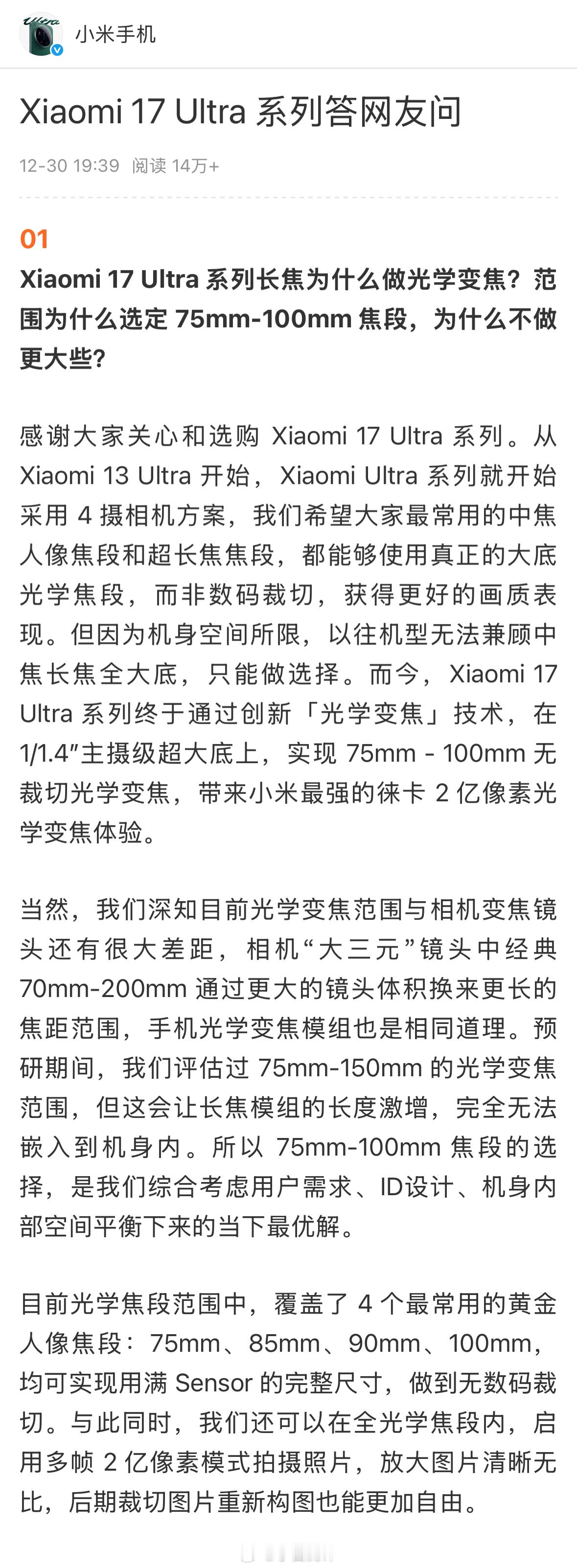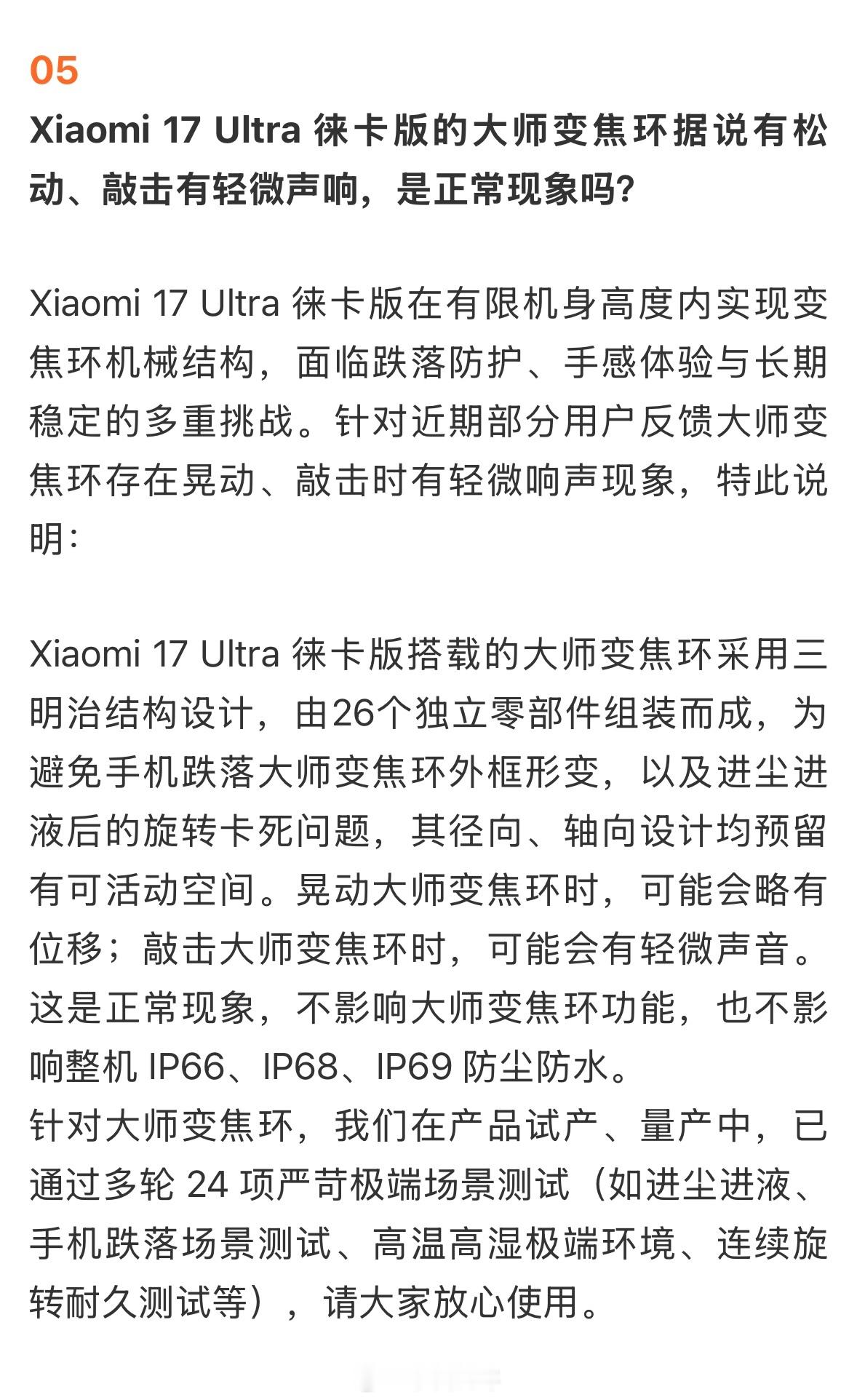 才刷到这条小米发了个答网友问回应了小米17Ultra徕卡版变焦环“松动”和“