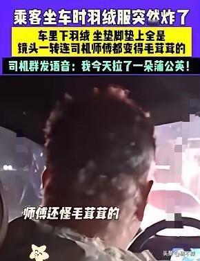 太逗了!河北一女生打车回家,坐上车没多久,就听见 “嘣” 的一声,女生的羽绒服直接炸开,羽绒瞬间漫天飞舞 司机的头发上、座椅上全被糊满,活脱脱变成了“毛茸茸版”的自己。 本以为会是一场尴尬的争执,没想到司机心态绝了!不仅没生气,还在亲友群发吐槽:“今天拉了朵会走路的蒲公英”。 这波幽默直接化解了所有窘迫,女生也放下心理负担,举着手机拍个不停! 其实生活里的小意外真的不可怕,可怕的是揪着这点小事不放的较真劲儿。 一句玩笑话,就能把糟心事变成乐子,这才是藏在烟火气里的高情商处事智慧! 对此你怎么看?欢迎在评论区留言交流!