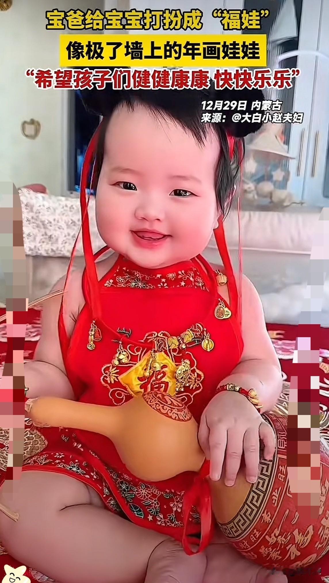 这下科学也解释不清了!近日呼和浩特,宝妈走进女儿的房间,发现九个月大的女儿居然不见了,而床上却出现了一个可爱的小福娃,九个月大的娃直接变身年画里走出来的小福星! 大红肚兜配红飘带丸子头,金饰项圈加小手链,手边还摆着两只印“福”字的大龙,宝爸照着年画娃娃的脑洞打扮,把娃变成了行走的福气发射器。 宝宝对着镜头咧嘴一笑,粉嘟嘟的脸蛋甜到人心坎里,连新华社都忍不住转发点赞。 这哪是简单的扮靓,分明是把中国人刻在骨子里的祈福仪式玩出了新花样。 年画娃娃的传承从不是冰冷的图案,而是长辈把“健康快乐”的朴实愿望,悄悄缝进孩子的穿戴里。2026年的年味儿,被这娃提前拉满了!