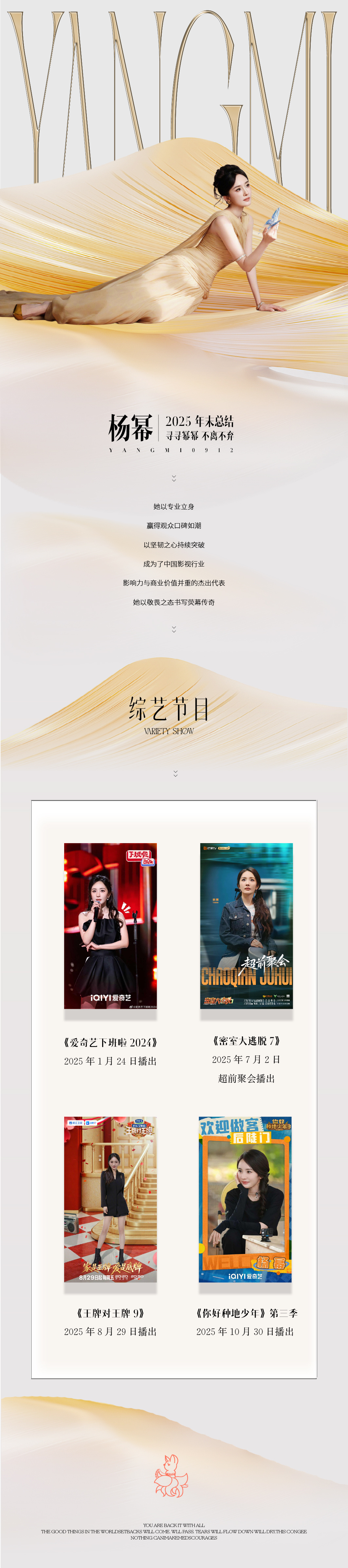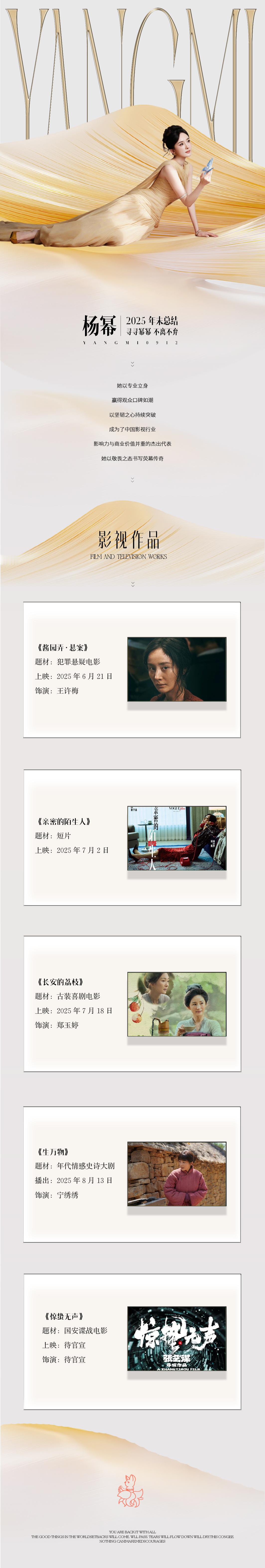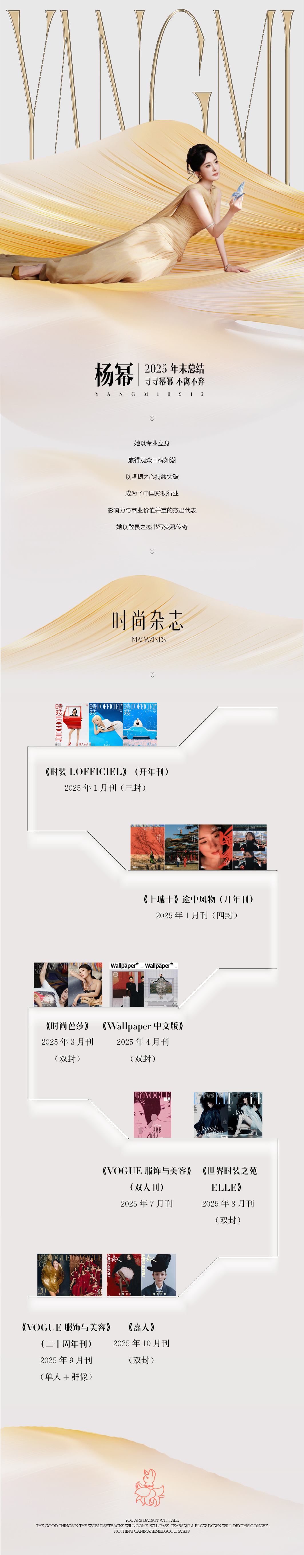 杨幂ym杨幂 亲爱的蜜蜂们:⏰当岁末的钟声即将敲响,我们又一起陪伴杨幂走过了充盈而丰硕的一年。回望2025,这并非仅仅是成果的陈列,更是一段关于向下扎根、向内探索、向上生长的动人叙事。此刻,让我们透过这些定格时光的影像,共同翻阅这份属于她,也属于我们每一个人的年度总结与光同航,共赴新章。翻阅这份总结,你是否也和我们一样心潮澎湃,我们见证的,不仅是一个女演员的丰收年,更是一个女性不断探索生命广度与深度的成长史诗她从不止步。在表演的沃土上向下扎根,在人生的舞台上向外探索。她用行动告诉我们:真正的强大,是敢于素颜面对真实的粗糙,也有底气驾驭百套高定的华美新的一年,让我们继续这份美好的双向奔赴。像她一样,在自己的领域里深耕不辍;像她一样,对世界怀抱温柔与善意。因为她,我们相聚;因为彼此,我们成为更好的自己✨2025,感谢有你;2026,与幂同行,万物生长回望2025,杨幂用每一步都走得坚实有力。她在《生万物》里扎根泥土,让角色破土生长;在荧幕内外,收获国际提名与“年度演员”的肯定。她探访孩童播撒善意,也以百套高定和《VOGUE》开年封面定义风尚。这一年,她不仅是光芒闪烁的演员,更是温柔坚定的力量最后感谢每一位蜜蜂的陪伴。新的一年,让我们继续与光同行,见证她创造更多可能