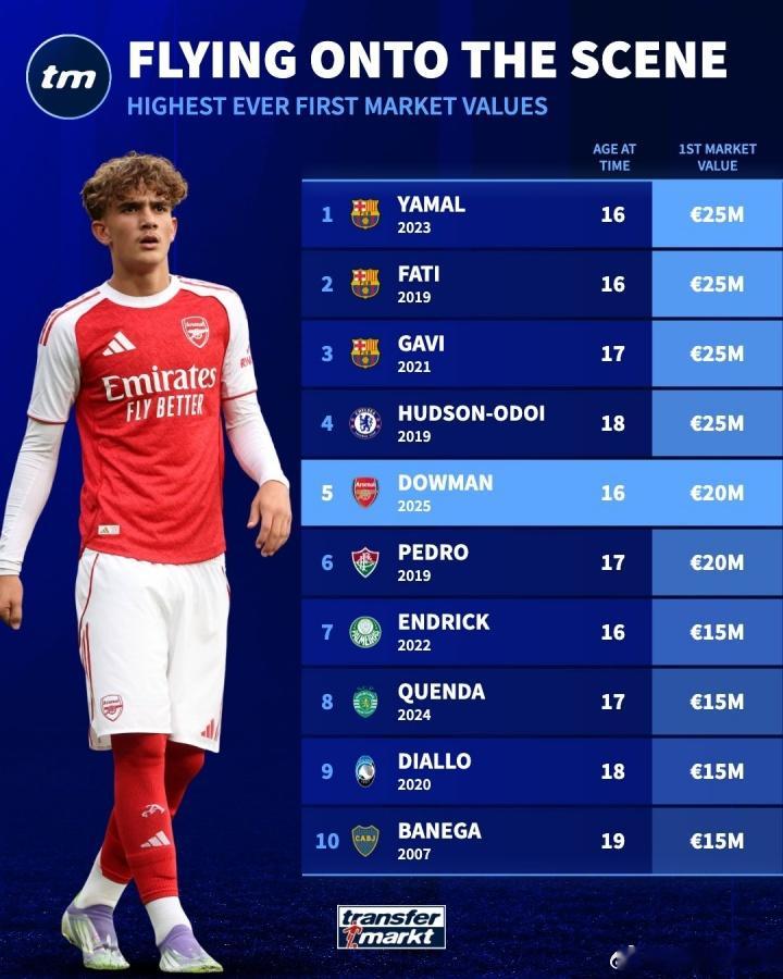 0→身价2000万!道曼今日16岁生日,德转初始身价2000万排历史第5今日是阿森纳小将道曼16岁生日,德转也在今日首次给他的身价进行估值。德转表示,考虑到道曼在俱乐部以及英格兰青年队的巨大影响力,在如此小的年龄所取得的一线队成绩,还有球员的热度。因此给道曼的身价估值2000万欧元。值得一提的是,在德转所有球员初始身价估值中,道曼2000万欧元排在历史第五位。前四位分别是亚马尔(16岁、2500万)、法蒂(16岁、2500万)、加维(17岁、2500万)以及奥多伊(18岁、2500万)。道曼本赛季已经代表阿森纳一线队出场5次,也打破了欧冠历史最年轻出场纪录。