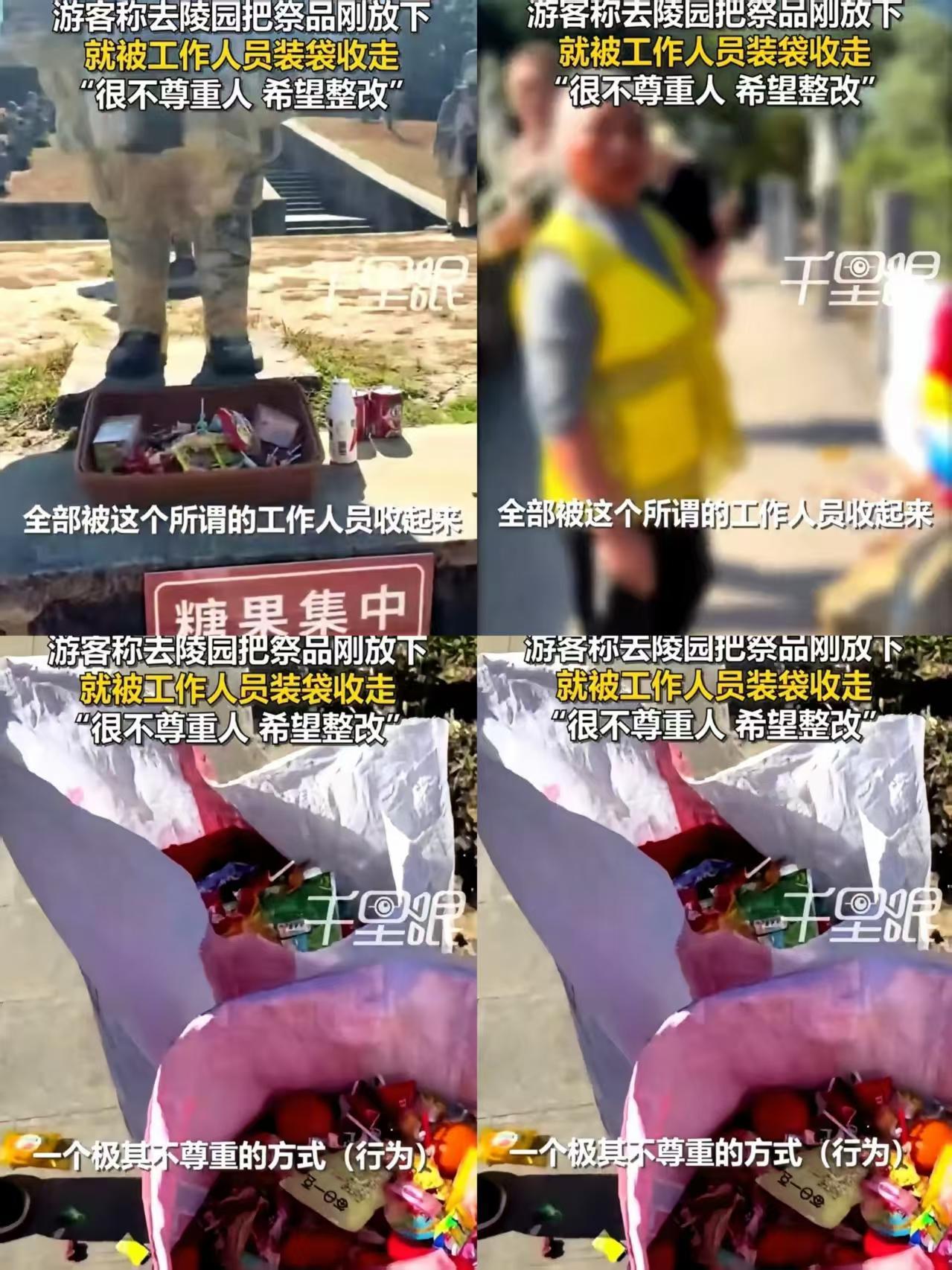 云南保山烈士陵园,一名外地男子刚放下祭品转身,身后突然传来“哗啦”一声。 他猛地回头,瞬间心头一紧——穿工作服的人正把他的水果点心,连同旁人的祭品,一股脑倒进大麻袋,动作利索得像在清理垃圾。男子快步上前质问,对方却眼皮都没抬:“公司规定,及时清理,保持卫生。” 旁边堆着三大袋鼓鼓囊囊的祭品,全是人们刚放下的心意。男子从几百公里外赶来,在台阶下站了许久才摆好祭品,本想让这份敬意多停留片刻,谁知连个转身的功夫都没给。 祭拜敬的是心不是物,心还没落下,祭品就成了垃圾,这样的“规矩”,实在让人难以接受!