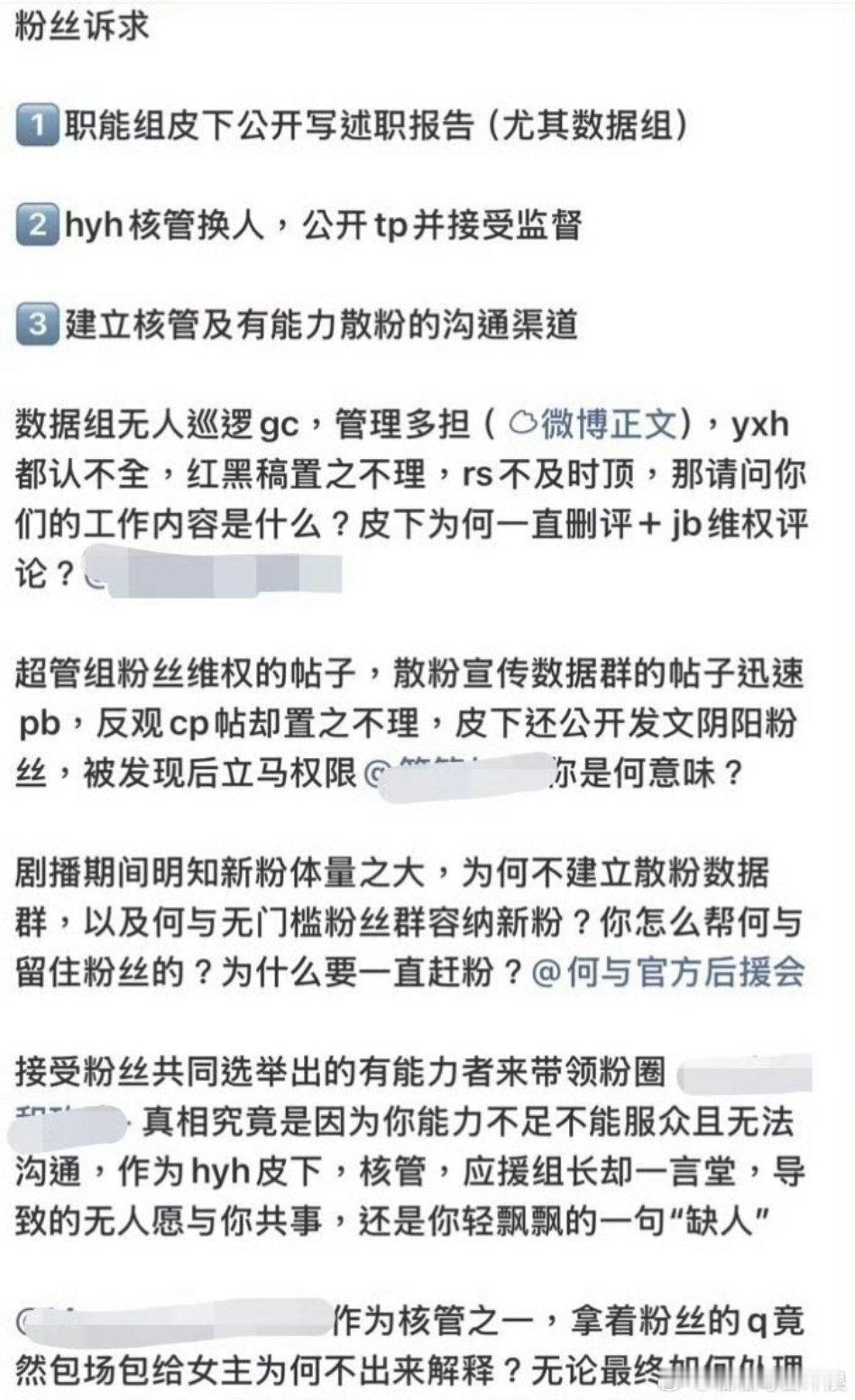 何与粉丝要求后援会回应散粉诉求,说双轨播出期间☁️bc都包错给女主,新剧开机注水旗将名字写错等各种问题,要求给出回应。