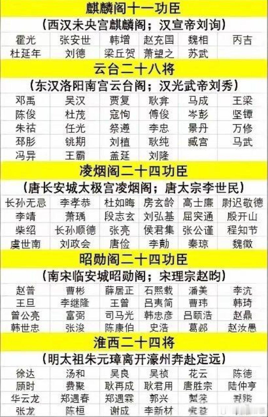汉唐宋明各朝代功臣榜西汉:麒麟阁十一功臣(西汉未央宫麒麟阁;汉宣帝刘询)霍光、张安世、韩增、魏相、杜延年、刘德、赵充国、梁丘贺、萧望之、苏武。东汉:云台二十八将(东汉洛阳南宫云台阁;汉光武帝刘秀)邓禹、吴汉、贾复、耿弇、寇恂、岑彭、冯异、朱祐、祭遵、景丹、盖延、铫期、耿纯、臧宫、马武、刘隆、马成、王梁、陈俊、杜茂、傅俊、坚镡、王霸、任光、李忠、万脩、邳彤、刘植。凌烟阁二十四功臣(唐长安城太极宫凌烟阁;唐太宗李世民)长孙无忌、李孝恭、杜如晦、魏徵、房玄龄、高士廉、尉迟敬德、李靖、萧瑀、段志玄、刘弘基、屈突通、殷开山、柴绍、长孙顺德、张亮、侯君集、张公瑾、程咬金、虞世南、刘政会、唐俭、李𪟝、秦琼。昭勋阁二十四功臣(南宋临安城昭勋阁;宋理宗赵昀)曹彬、李继隆、富弼、张浚、薛居正、王曾、司马光、陈康伯、石熙载、吕夷简、韩忠彦、史浩、潘美、曹玮、吕颐浩、葛邺。赵普、王旦、曾公亮、韩世忠。淮西二十四将(明太祖朱元璋离开濠州奔赴定远。)徐达、汤和、吴良、吴祯、花云、陈德、顾时、费聚、耿再成、耿君用、唐胜宗、陆仲亨、华云龙、郑遇春、郑遇霖、郭兴、郭英、胡海、张龙、陈桓、谢成、李新材、张赫、周德兴。