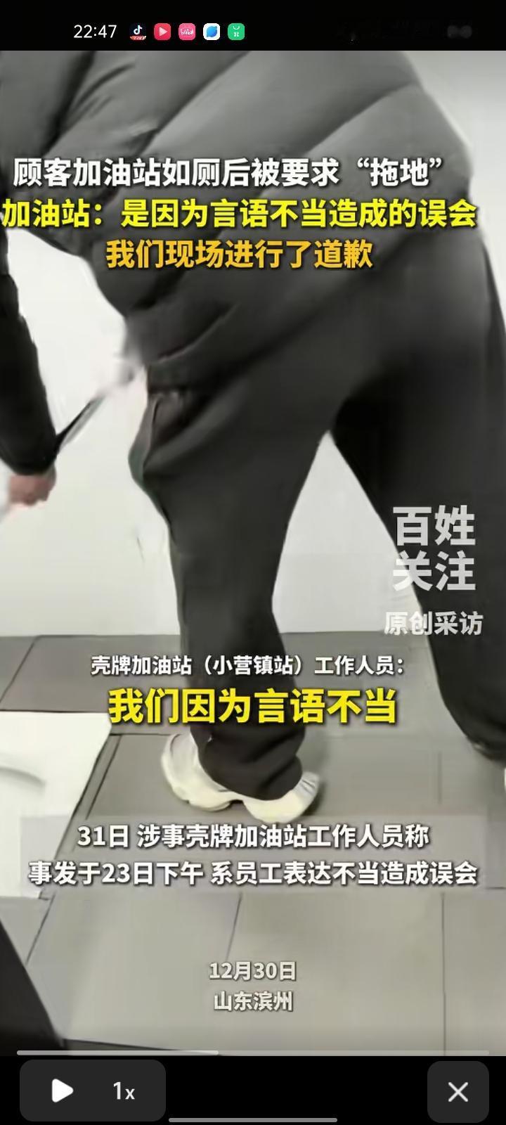 12月30日,山东滨州。网友晒视频称,自己在加油站如厕后,被要求“拖厕所”,这种奇葩事第一次听说过。 涉事加油站工作人员回应称,事发于23日下午,系员工表达不当造成误会,已对涉事加油站员工进行处理,公司内部也在反思整顿,并争取让当事人取得理解。 服务的核心从来不是冰冷的规则,而是人与人之间的尊重与体谅。对于加油站这类窗口单位而言,员工的沟通能力和服务意识,远比硬件设施更能打动人心。一句恰当的提醒,或许是 “麻烦您注意一下卫生哦,谢谢啦”;一次温和的引导,远比生硬的要求更易让人接受。