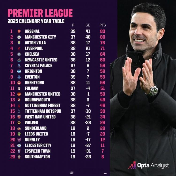 英超2025年度积分榜:1.阿森纳 39场 +41球 83分2.曼城 37场 +48球 80分3.阿斯顿维拉 38场 +17球 76分4.利物浦 38场 +21球 71分5.切尔西 38场 +17球 64分6.纽卡斯尔联 38场 +12球 60分7.水晶宫 37场 +8球 59分8.布莱顿 38场 +7球 59分9.埃弗顿 39场 +7球 59分10.布伦特福德 38场 +11球 58分11.富勒姆 37场 -4球 51分12.曼联 38场 -1球 50分13.伯恩茅斯 38场 0球 49分14.诺丁汉森林 38场 -7球 46分15.热刺 37场 -10球 39分16.西汉姆联 38场 -21球 34分17.狼队 38场 -33球 29分18.桑德兰 18场 +2球 28分19.利兹联 18场 -7球 20分20.伯恩利 19场 -17球 12分21.莱斯特城 19场 -27球 11分22.伊普斯维奇 19场 -31球 7分23.南安普顿 19场 -33球 6分