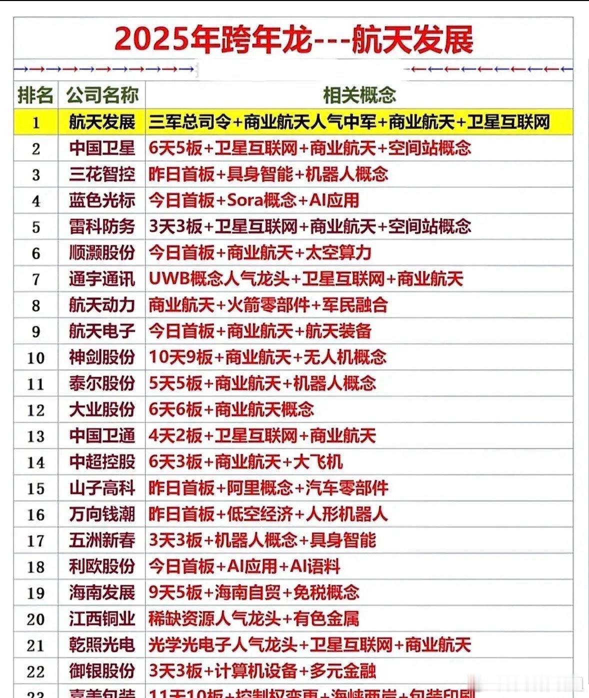 跨年龙就是这只股!本次梳理聚焦2025年跨年行情,23只个股集中在商业航天、卫星互联网、AI应用、机器人等热门赛道。其中航天系公司扎堆,"航天发展"被定为龙头,连板股和人气标的众多,反映出资金对跨年主线的高度共识和积极布局。个股梳理分析1. 航天发展:被冠以"三军总司令"称号,叠加商业航天与卫星互联网,是当之无愧的跨年龙头,概念辨识度和市场人气都一骑绝尘,成为资金布局的核心锚点。2. 中国卫星:以6天5板的强势姿态领涨,覆盖卫星互联网、商业航天等多个主线概念,作为航天国家队成员,其趋势性行情已完全打开。3. 三花智控:昨日首板启动,搭上具身智能和机器人概念的东风,作为赛道核心标的,首板后有望成为资金接力的新焦点。4. 蓝色光标:今日首板,因Sora概念和AI应用方向受到资金追捧,是AI应用领域的人气标杆,首板启动信号非常明确。5. 雷科防务:走出3天3板的连板走势,商业航天、卫星互联网等概念加持,在航天主线上形成了强势的跟风效应。6. 顺灏股份:今日首板,叠加商业航天和太空算力概念,在算力和航天的双重热点下,为市场提供了新的想象空间。7. 通宇通讯:是UWB概念的人气龙头,同时覆盖卫星互联网和商业航天,概念延展性强,是资金在细分领域的重要选择。8. 航天动力:聚焦商业航天和火箭零部件,属于航天产业链的核心环节,军民融合的背景也为其增添了独特的投资逻辑。9. 航天电子:今日首板,商业航天和航天装备概念纯正,作为航天系的重要成员,首板启动后存在明显的补涨预期。10. 神剑股份:走出10天9板的超级连板行情,叠加商业航天和无人机概念,是跨年行情中连板高度的标杆,市场人气旺盛。11. 泰尔股份:实现5天5板的连板走势,商业航天和机器人概念双轮驱动,在两条主线上都获得了资金的高度认可。12. 大业股份:以6天6板的强势表现,在单纯的商业航天概念下走出独立连板行情,是该概念的人气先锋。13. 中国卫通:4天2板的稳健走势,作为卫星互联网和商业航天的核心标的,行业巨头的地位为其提供了稳定的号召力。14. 中超控股:6天3板,商业航天叠加了大飞机概念,在两个高端制造赛道上都有布局,概念兼容性和延展性强。15. 山子高科:昨日首板,阿里概念和汽车零部件的结合,在跨年的科技主线中,为资金挖掘了新的细分突破口。16. 万向钱潮:昨日首板,低空经济和人形机器人概念,是近期资金挖掘的新方向,具备成为跨年新主线的潜力。17. 五洲新春:3天3板,机器人和具身智能概念,是AI硬件方向的代表,反映了资金对AI应用落地的强烈预期。18. 利欧股份:今日首板,AI应用和AI语料概念,在AI大模型持续火热的背景下,基础数据服务的价值开始凸显。19. 海南发展:9天5板,海南自贸和免税概念,是地域主题和消费复苏的结合,为跨年行情提供了多元化的选择。20. 江西铜业:稀缺资源的人气龙头,有色金属的核心标的,反映了资金在跨年行情中对资源类资产的配置需求。21. 乾照光电:光学光电子的人气龙头,叠加卫星互联网和商业航天,在航天和科技两个主线上都占据重要地位。22. 御银股份:3天3板,计算机设备和多元金融,是金融科技方向的代表,体现了资金对低位补涨标的的挖掘。23. 嘉美包装:走出11天10板的超高连板,控制权变更和海峡两岸概念,是跨年行情中重组和地域主题的一匹黑马。总结跨年行情的主线已非常清晰,商业航天、卫星互联网、AI应用和机器人是绝对的主角。市场情绪高涨,连板高度和人气龙头层出不穷。资金围绕这些主线,既布局了核心龙头,也挖掘了细分领域的补涨机会,同时兼顾了地域主题和资源类资产,形成了多层次、立体化的跨年行情。本文涉及资讯、数据等内容来自网络公共信息,仅供参考,不构成投资建议!