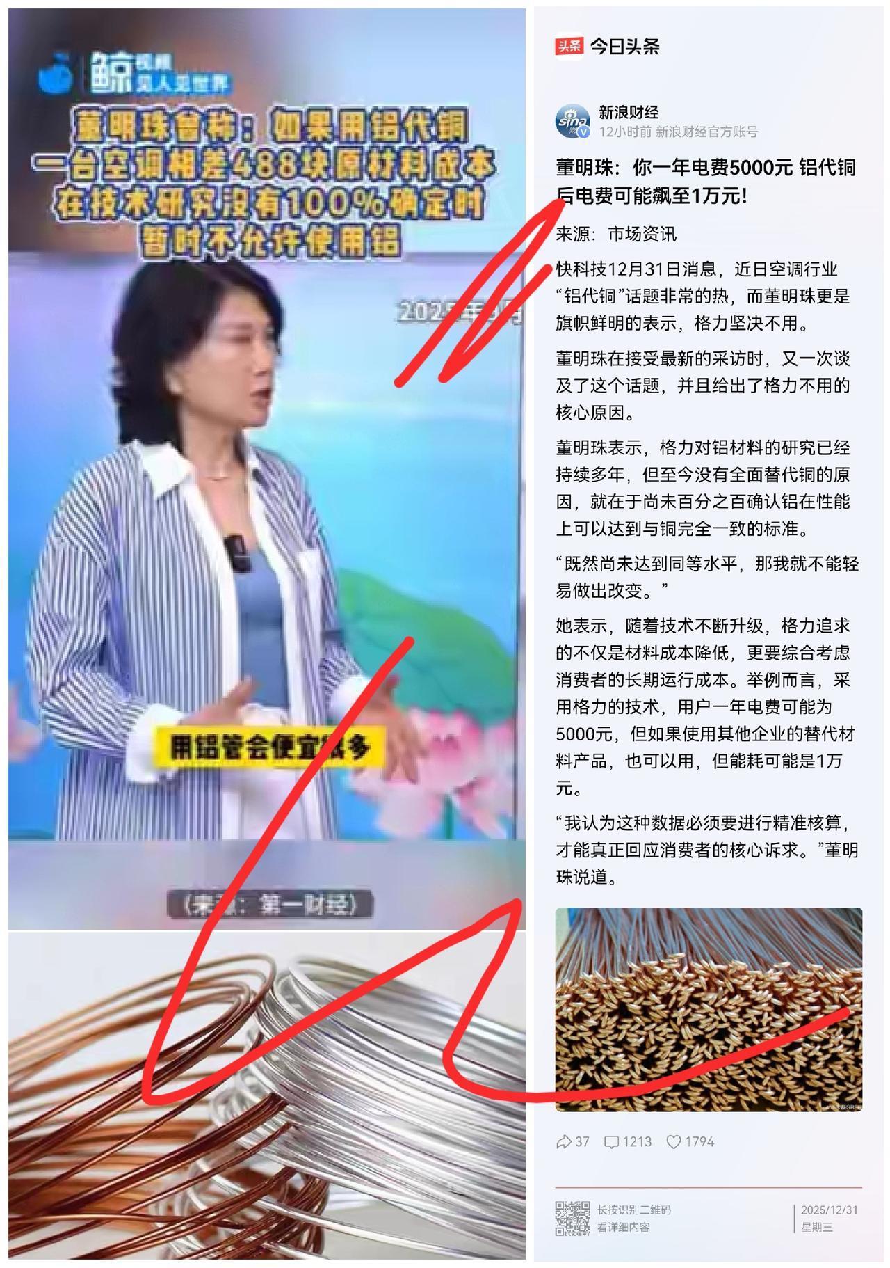 她争的不是管子,是规矩 董明珠“炮轰”铝管,真意在价格之外。她是在为空调行业立新规:好产品的标准,不该是买时多便宜,而是十年里为你省了多少心、省了多少钱。 咱们今天就把这事儿聊透。董明珠这次开炮,动静不小,但好多人光顾着站队了,没看懂这场大戏到底在演啥。 第一,董明珠到底图啥?她闲得慌吗? 不,她精明得很。她这不是在吵架,是在 “定规矩”。 她心里清楚,如果大家都闷声不响全换成铝管,空调是会便宜三五百。但用几年后,电费高了、机器坏了,用户骂的是谁?是整个“空调行业”。格力作为老大,首当其冲。 所以她要大声喊出来,把一条新规矩砸进所有人心里:评判空调好不好,别光看买的时候贵不贵,得算十年里你为它花了多少钱。 她卖的不仅是空调,更是一个“长久、省心、划算”的标准。这招成了,格力“真材实料”的牌子就固若金汤了。 第二,这是不是格力在打压对手,搞内卷?恰恰相反,她是在 “反内卷”。 现在很多行业的内卷是啥?是“偷工减料降价格,大家一起往下滑”。铝如果只是为了便宜而替代铜,性能却跟不上,那就是典型的内卷下滑。 董明珠这一嗓子,等于把下滑的电梯给按停了。她等于说:“都别往下出溜了!要么,你真有本事把铝做得跟铜一样好,我佩服你;要么,咱们就都老老实实在‘耐用、省电’这个高水平上竞争。” 这不是打压,这是把战场从泥地拽到了高地。 逼着大家往上走。 第三,咱们普通人该咋看?会不会被当枪使? 最容易的就是被带节奏。一听“铝=坏,铜=好”,立刻选边站。 但咱们得清醒:世界不是非黑即白,关键看“合不合适”。 假如你在东北,夏天就热那么一阵,空调一年开俩月。一台标明用铝、价格实在的合格空调,对你可能就是划算的。 但如果你在广东,空调是“续命神器”,一年开八个月,还潮湿。那铝管在耐腐蚀和长期能效上的短板就会被放大,全铜管可能就是更明智的选择。 所以,咱们普通人最该关心的不是材料,而是 “知情权”。我们得要求:空调得像食品一样,有个“配料表”——清清楚楚写明核心换热器是“全铜”、“铜铝复合”还是“全铝”,并提供权威的长期性能参考数据。把选择权,明明白白交回我们自己手里。 第四,上升到国家高度,为啥推“铝代铜”? 这才是格局打开的关键。咱们国家 “缺铜,富铝” 。铜大量靠进口,铝自己就能管够。从国家供应链安全的大战略看,推动“铝代铜”研究,方向绝对正确。 但国家要的,绝不是“以次充好”,而是 “创新替代” 。是希望你通过技术升级,把相对便宜的铝,做出媲美甚至超越铜的性能。这才是真正的产业升级。 所以你看,董明珠的坚持(守住当下质量底线)和国家的方向(鼓励未来技术突破),在根子上不矛盾,只是一个看眼前,一个看长远。 说到底,这场“铜铝大战”给我们的启发是什么? 三句话: ①对企业:别总琢磨怎么省钱,要琢磨怎么用技术把便宜材料做出高级货。那才叫真本事。 ②对行业:别玩模糊,赶紧定下明规则。是什么材,就标什么名,凭真数据说话。 ③对咱们:别做任何品牌的粉丝,要做自己钱包和时间的裁判。谁把复杂的信息透明、老实地告诉你,你就用钱给谁投票。 争的不是一根管子,而是中国制造的未来,到底走哪条路:是凑合用、便宜卖的路?还是下功夫、值得久用的路? 这场架,谁输谁赢不重要。重要的是,经过这么一吵,咱们老百姓更明白了,行业里那些模糊地带也被照亮了。 这,就是最大的意义。