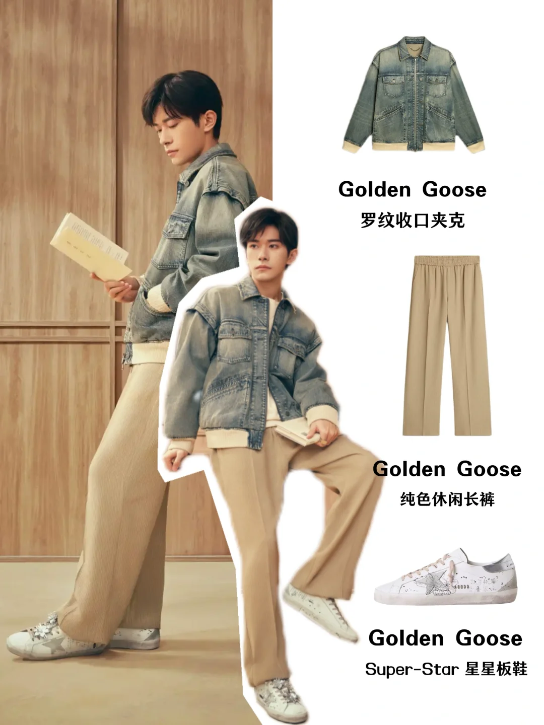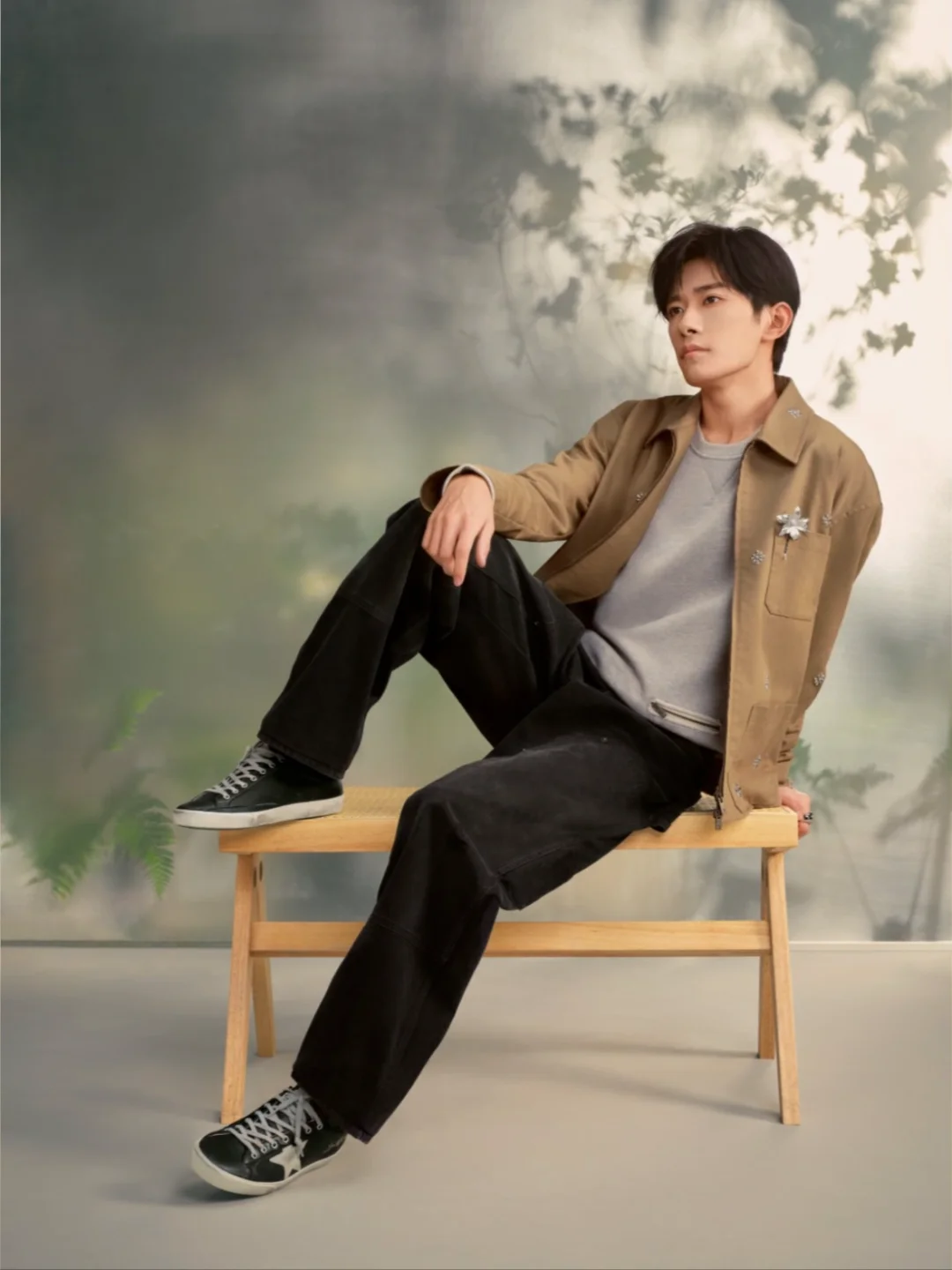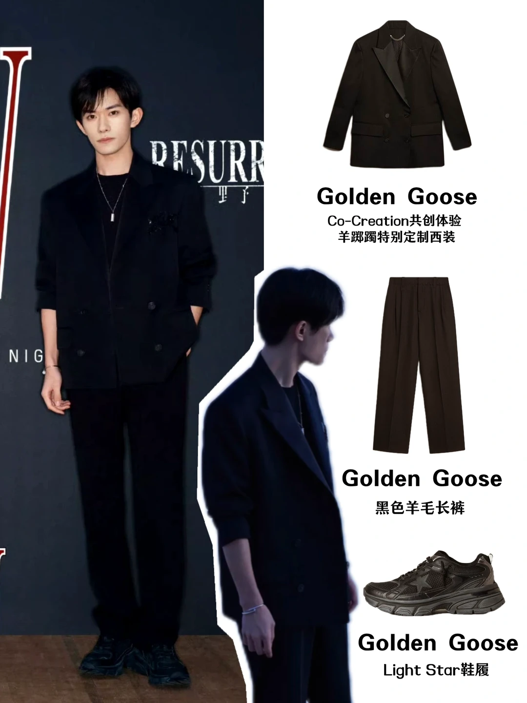 第一套造型,身着Golden Goose Co-Creation特别定制西装,搭配黑色长裤,整体风格简约又不失格调。黑色系的运用,更是凸显出他沉稳内敛的气质。