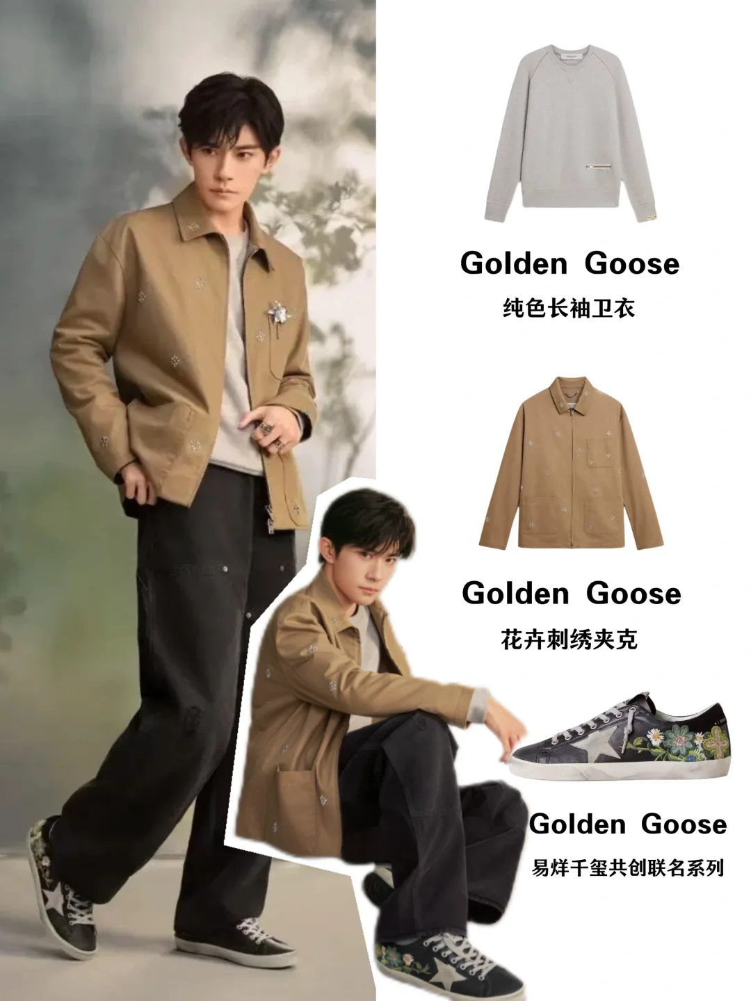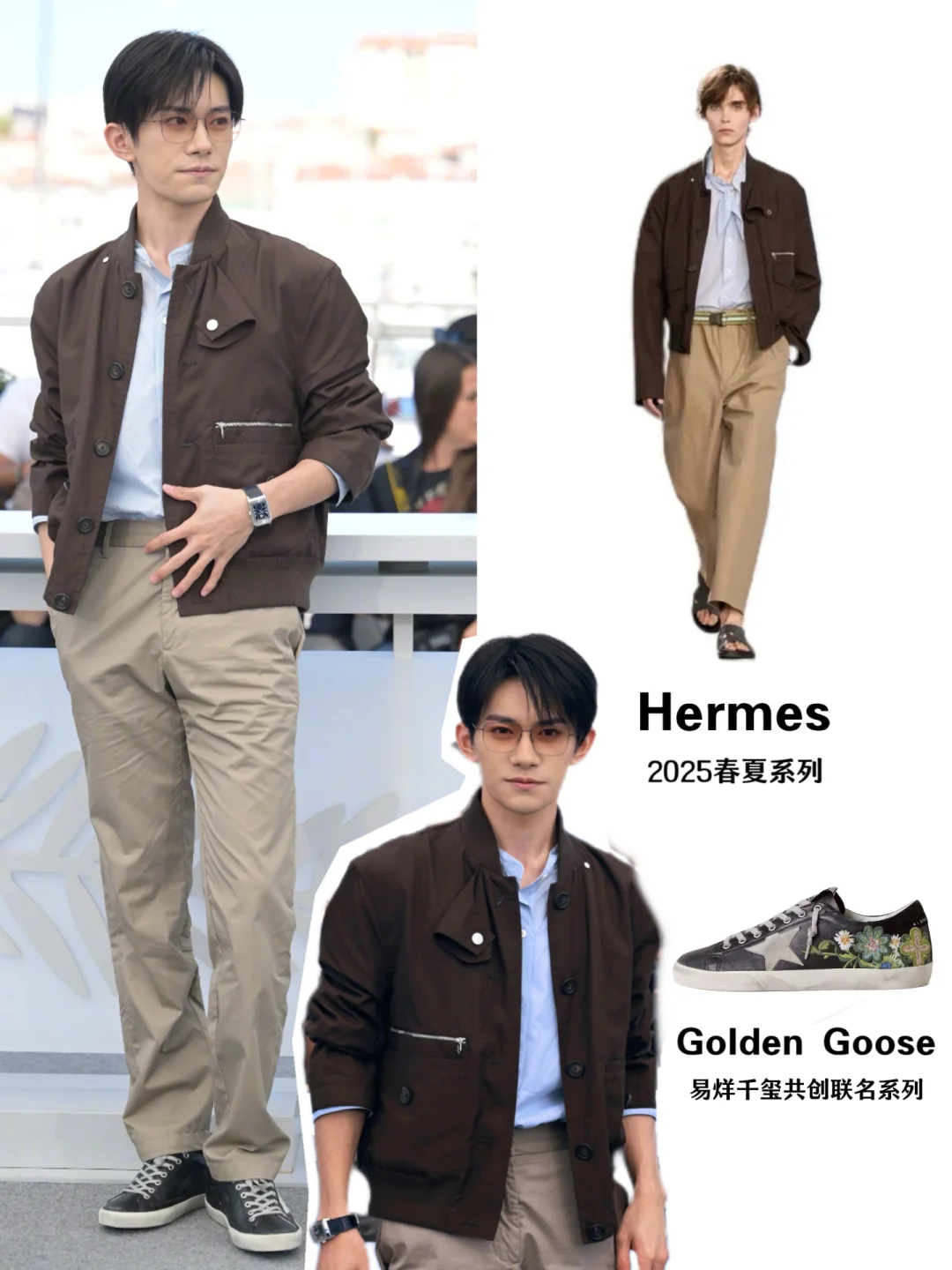 第二套造型,在戛纳photo call环节,易烊千玺选择了他亲自参与共创设计的Golden Goose联名Super-Star鞋款,鞋面羊踯躅花纹为整体造加分,不仅呈现出独特的设计美学,更承载着他个人的创意表达与叙事视角。