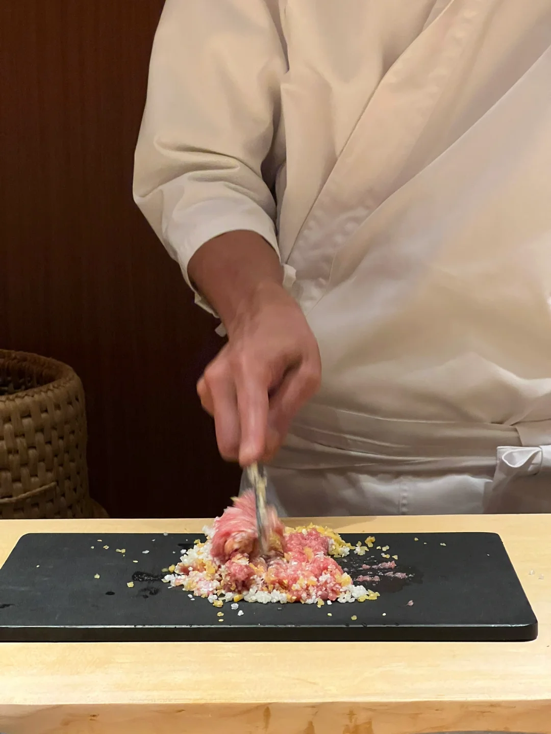 用 60%赤身和 40%大腹泥配上脆萝卜碎和洋葱的手卷好好吃