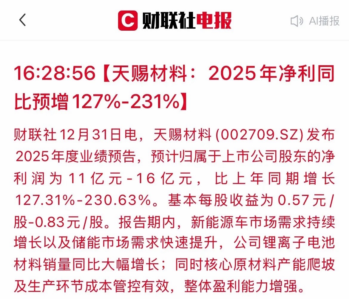锂电龙头“吸金”能力爆发!天赐材料预告净利最高飙涨230%,行业春天到了?刚刚,锂电材料巨头“天赐材料”交出“炸裂”成绩单。2025年度业绩预告显示,公司净利润预计最高可达16亿元,同比增幅有望超过230%。公告明确指出,新能源车市场持续渗透与储能需求的快速放量,共同推动公司锂离子电池材料销量“大幅增长”。这不仅折射出公司自身成本管控与产能释放的成效,更传递出行业积极信号——在经历产能过剩担忧后,具备技术、规模与成本优势的头部企业正率先突围。随着下游应用场景不断拓宽,锂电材料环节的头部集中趋势可能进一步凸显。在需求增长与成本控制双引擎推动下,这份业绩预告不仅展现了龙头企业的强劲韧性,也预示着锂电材料环节的盈利修复可能正在加速。龙头企业能否引领板块开启新一轮增长周期,值得持续关注。