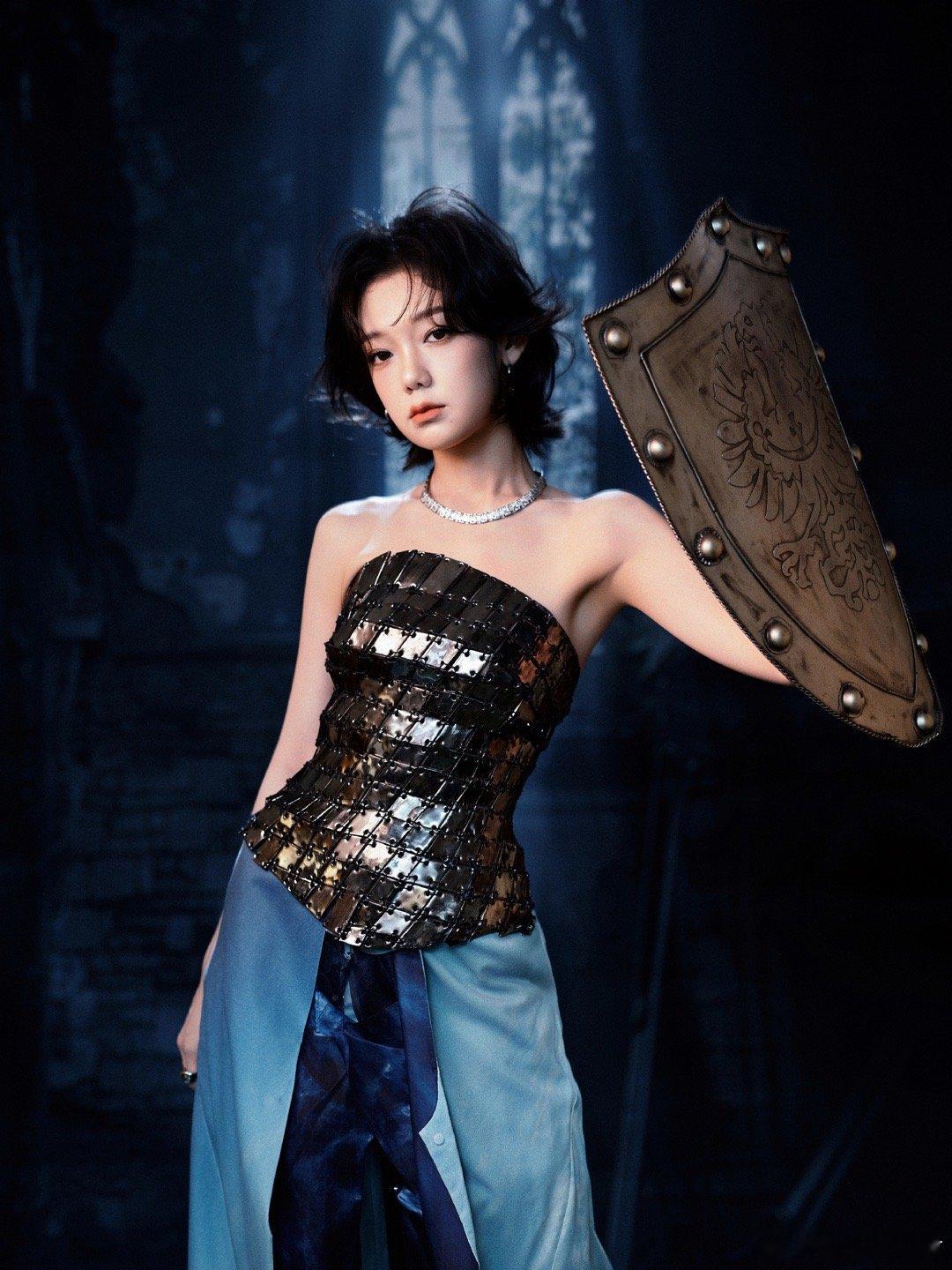 希林娜依高 女战士希林娜依高跨年高定战袍 飒与美的终极答案,是希林娜依高。跨年战袍勾勒出她的灵动轮廓,银色锋芒与蓝色柔光交织,裙摆翩跹如银河倾泻。这位从星光中走来的女战士,用一身璀璨,瞬间俘获了所有人的目光与心跳。
