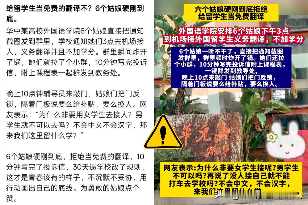 现在年轻人真是太硬扛了! 面对威逼利诱绝不妥协。 就说某学校安排6位女生去给不懂中文的留学生当翻译,这6位女生压根不妥协,直接写投诉信,逼得学校改规则。 放在以前,80后、90后遇上学校安排的“额外任务”,哪怕心里一百个不乐意,大概率也会想着“多一事不如少一事”,先把事情应付过去。但00后偏不,她们直接写投诉信,明确表态留学生来华,掌握中文是基本要求,没道理让本校学生为别人的语言短板买单。 这背后不是叛逆,是成长环境赋予的底气和清醒。00后成长在物质相对富足、信息更透明的时代,不用为了“安稳”过度妥协,更懂得捍卫自己的合理权益。教育部早就有规定,汉语是国际学生的必修课,学校本该督促留学生提升中文能力,而非把责任转嫁到普通学生身上。 她们的拒绝,本质上是在对抗“不合理的默认规则”。就像职场上00后拒绝无偿加班、拆穿画饼套路一样,这些年轻人不是不想承担责任,而是不愿为越界的要求买单。她们清楚自己的职责边界,也明白公平不是靠忍出来的,而是靠合理表达争取来的。 很多人觉得00后“难管”,其实是旧有的思维模式跟不上新的时代。以前的“隐忍”背后,藏着太多无奈的妥协,而00后的“直接”,恰恰倒逼规则变得更公平、更透明。学校最终修改规则,不就是最好的证明吗? 这种对合理边界的坚守,不是自私,而是社会进步的体现。当年轻人不再被动接受不合理的安排,敢于用正当方式表达诉求,整个环境才会越来越规范。 你身边有没有00后用自己的方式捍卫合理权益的事?你觉得这种“不妥协”是好事吗?