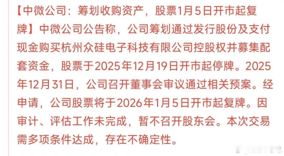 中微公司要复牌了,这时间点有点巧!12月19日因收购停牌,现在收购还没完成(审计评估都没做完,后续还有多重审批),却赶着半导体国产设备50%占比的政策东风复牌。作为设备龙头,这波难免让人觉得是蹭利好,不过短期确实有提振可能;但中途复牌有风险,收购若有变数,股价可能波动。