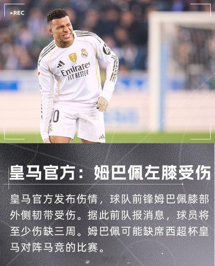 或缺战西超杯!皇马官方消息,球队前锋姆巴佩左膝扭伤。据此前法媒《队报》消息,球员为膝部外侧韧带受伤,将至少伤缺三周。