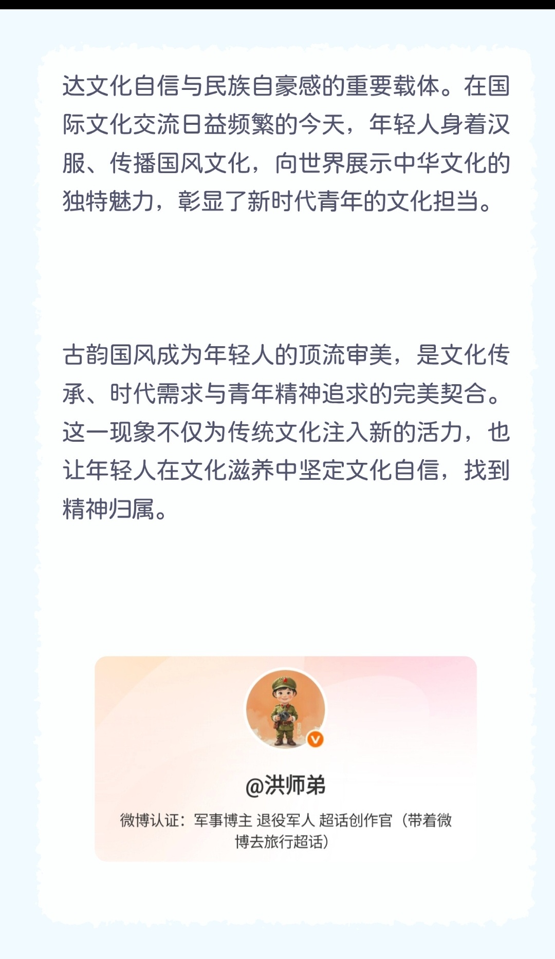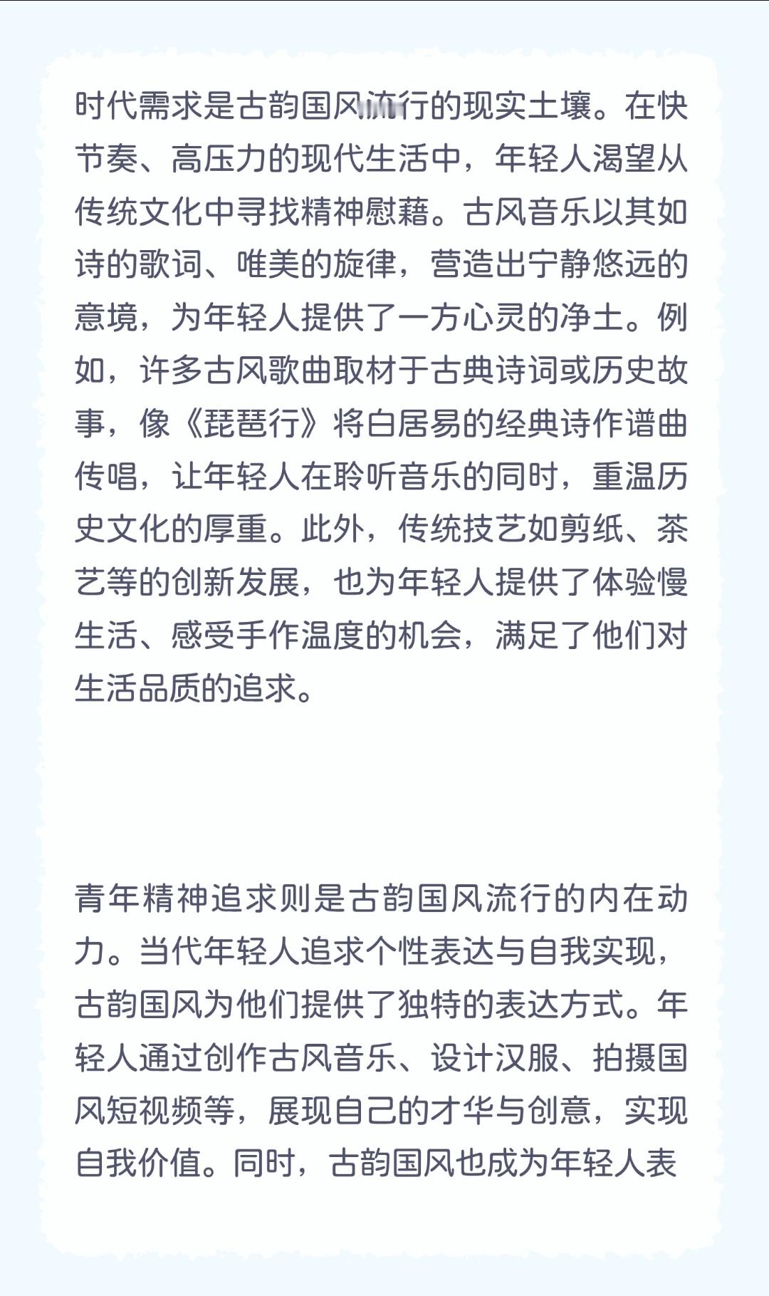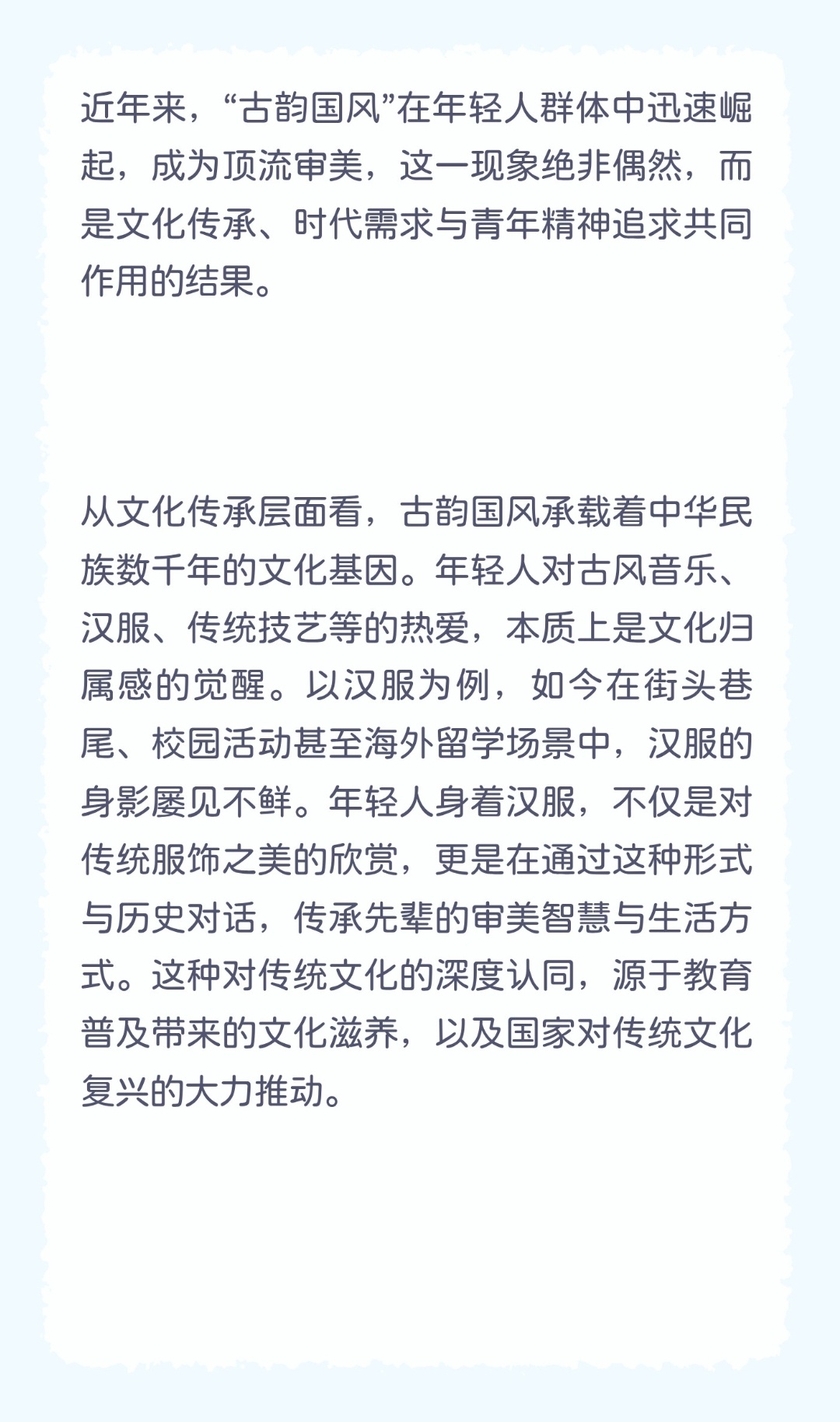 | 近年来,“古韵国风”在年轻人群体中迅速崛起,成为顶流审美。年轻人对古风音乐、汉服、传统技艺等的热爱,本质上是文化归属感的觉醒。以汉服为例,如今在街头巷尾、校园活动甚至海外留学场景中,汉服的身影屡见不鲜。年轻人身着汉服,不仅是对传统服饰之美的欣赏,更是在通过这种形式与历史对话,传承先辈的审美智慧与生活方式。这种对传统文化的深度认同,源于教育普及带来的文化滋养,以及国家对传统文化复兴的大力推动。在生活中,年轻人渴望从传统文化中寻找精神慰藉。古风音乐以其如诗的歌词、唯美的旋律,营造出宁静悠远的意境,为年轻人提供了一方心灵的净土。例如,许多古风歌曲取材于古典诗词或历史故事,像《琵琶行》将白居易的经典诗作谱曲传唱,让年轻人在聆听音乐的同时,重温历史文化的厚重。此外,传统技艺如剪纸、茶艺等的创新发展,也为年轻人提供了体验慢生活、感受手作温度的机会,满足了他们对生活品质的追求。当代年轻人追求个性表达与自我实现,古韵国风为他们提供了独特的表达方式。年轻人通过创作古风音乐、设计汉服、拍摄国风短视频等,展现自己的才华与创意,实现自我价值。同时,古韵国风也成为年轻人表达文化自信与民族自豪感的重要载体。在国际文化交流日益频繁的今天,年轻人身着汉服、传播国风文化,向世界展示中华文化的独特魅力,彰显了新时代青年的文化担当。古韵国风成为年轻人的顶流审美,是文化传承、时代需求与青年精神追求的完美契合。这一现象不仅为传统文化注入新的活力,也让年轻人在文化滋养中坚定文化自信,找到精神归属。