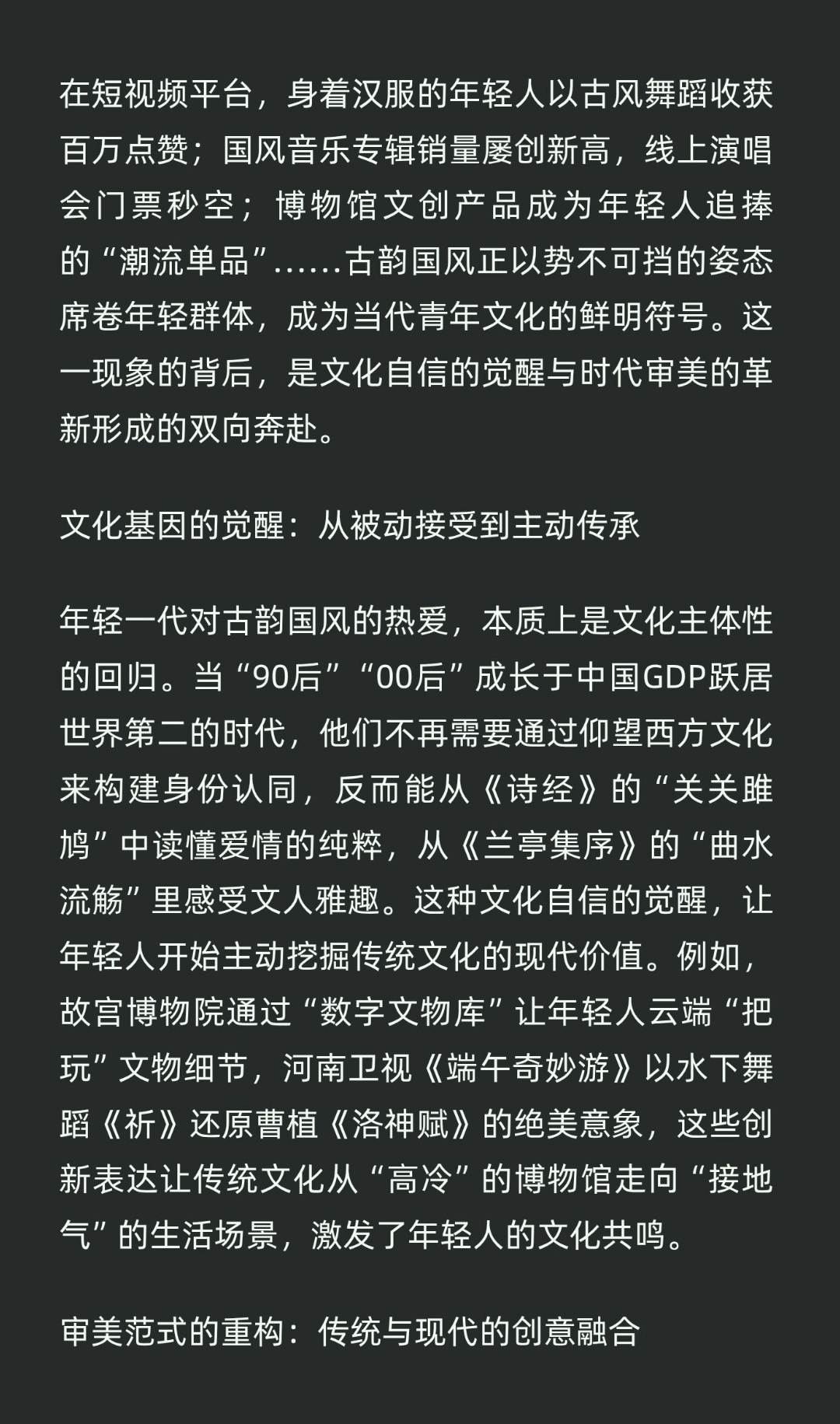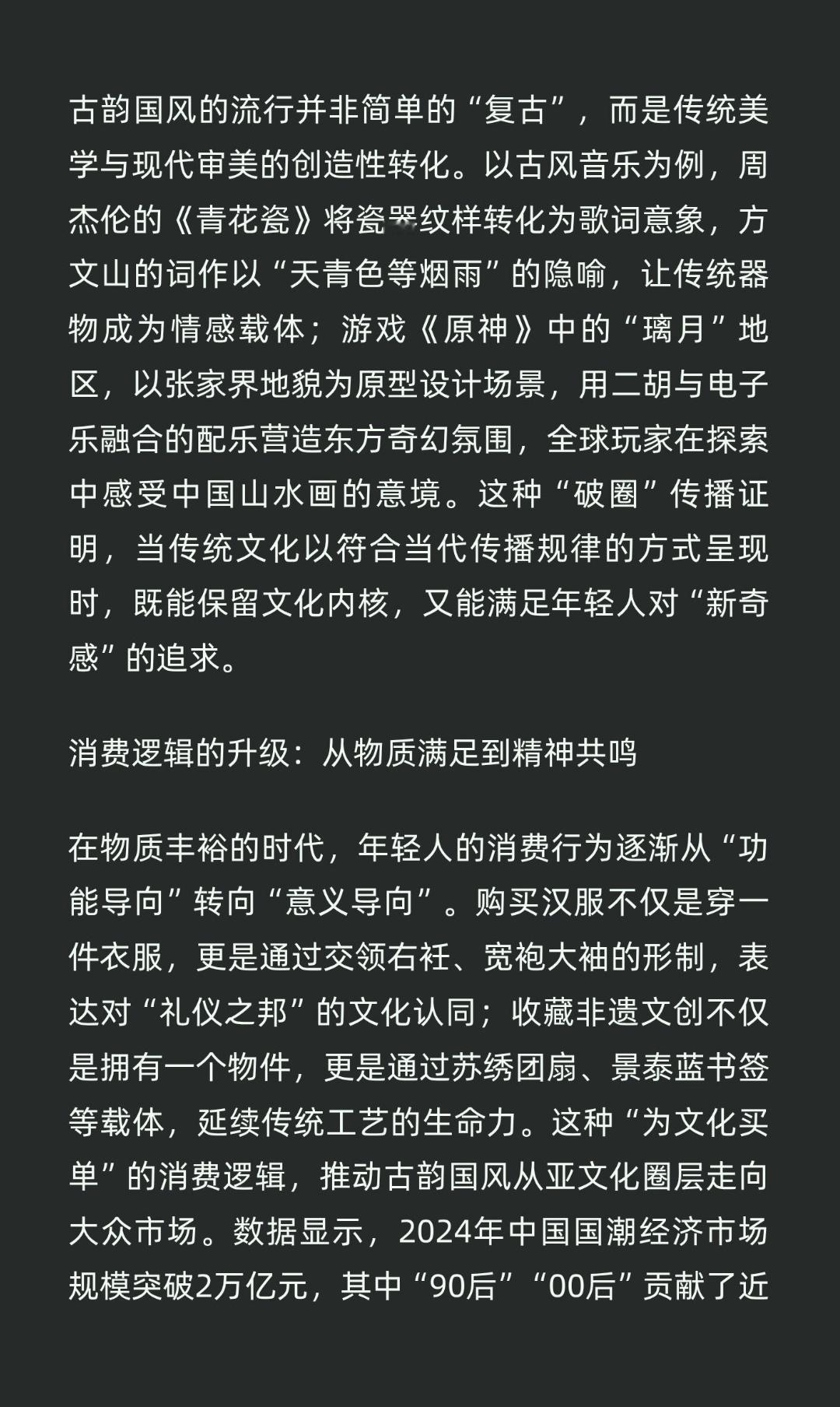 | 在短视频平台,身着汉服的年轻人以古风舞蹈收获百万点赞;国风音乐专辑销量屡创新高,线上演唱会门票秒空;博物馆文创产品成为年轻人追捧的“潮流单品”……古韵国风正以势不可挡的姿态席卷年轻群体,成为当代青年文化的鲜明符号。这一现象的背后,是文化自信与时代审美的双向奔赴。当“90后”“00后”成长于中国GDP跃居世界第二的时代,他们不再需要通过仰望西方文化来构建身份认同,反而能从《诗经》的“关关雎鸠”中读懂爱情的纯粹,从《兰亭集序》的“曲水流觞”里感受文人雅趣。这种文化自信的觉醒,让年轻人开始主动挖掘传统文化的现代价值。例如,故宫博物院通过“数字文物库”让年轻人云端“把玩”文物细节,河南卫视《端午奇妙游》以水下舞蹈《祈》还原曹植《洛神赋》的绝美意象,这些创新表达让传统文化从“高冷”的博物馆走向“接地气”的生活场景,激发了年轻人的文化共鸣。以古风音乐为例,周杰伦的《青花瓷》将瓷器纹样转化为歌词意象,方文山的词作以“天青色等烟雨”的隐喻,让传统器物成为情感载体;游戏《原神》中的“璃月”地区,以张家界地貌为原型设计场景,用二胡与电子乐融合的配乐营造东方奇幻氛围,全球玩家在探索中感受中国山水画的意境。这种“破圈”传播证明,当传统文化以符合当代传播规律的方式呈现时,既能保留文化内核,又能满足年轻人对“新奇感”的追求。当今,年轻人的消费行为逐渐从“功能导向”转向“意义导向”。购买汉服不仅是穿一件衣服,更是通过交领右衽、宽袍大袖的形制,表达对“礼仪之邦”的文化认同;收藏非遗文创不仅是拥有一个物件,更是通过苏绣团扇、景泰蓝书签等载体,延续传统工艺的生命力。这种“为文化买单”的消费逻辑,推动古韵国风从亚文化圈层走向大众市场。数据显示,2024年中国国潮经济市场规模突破2万亿元,其中“90后”“00后”贡献了近六成份额,印证了年轻人对文化消费的强劲需求。古韵国风的流行,是传统文化在当代的“创造性转化”,也是年轻人对文化身份的主动建构。当Z世代用古风音乐填满歌单、用汉服妆造定义时尚、用非遗文创装点生活时,他们不仅是在追赶潮流,更是在用行动回答“何以中国”的时代之问。这种文化自觉与审美革新,终将汇聚成推动中华文化走向世界的青春力量。