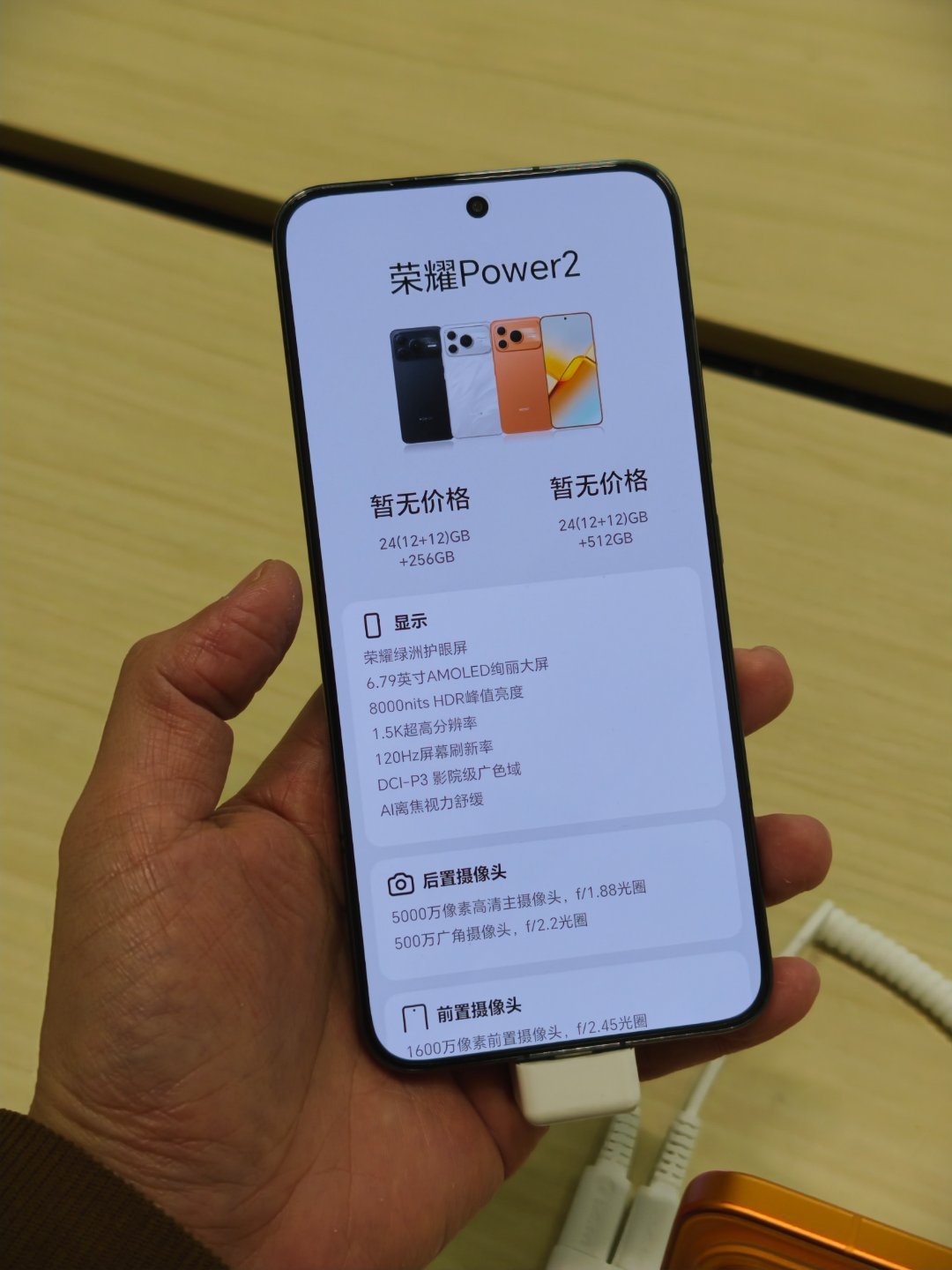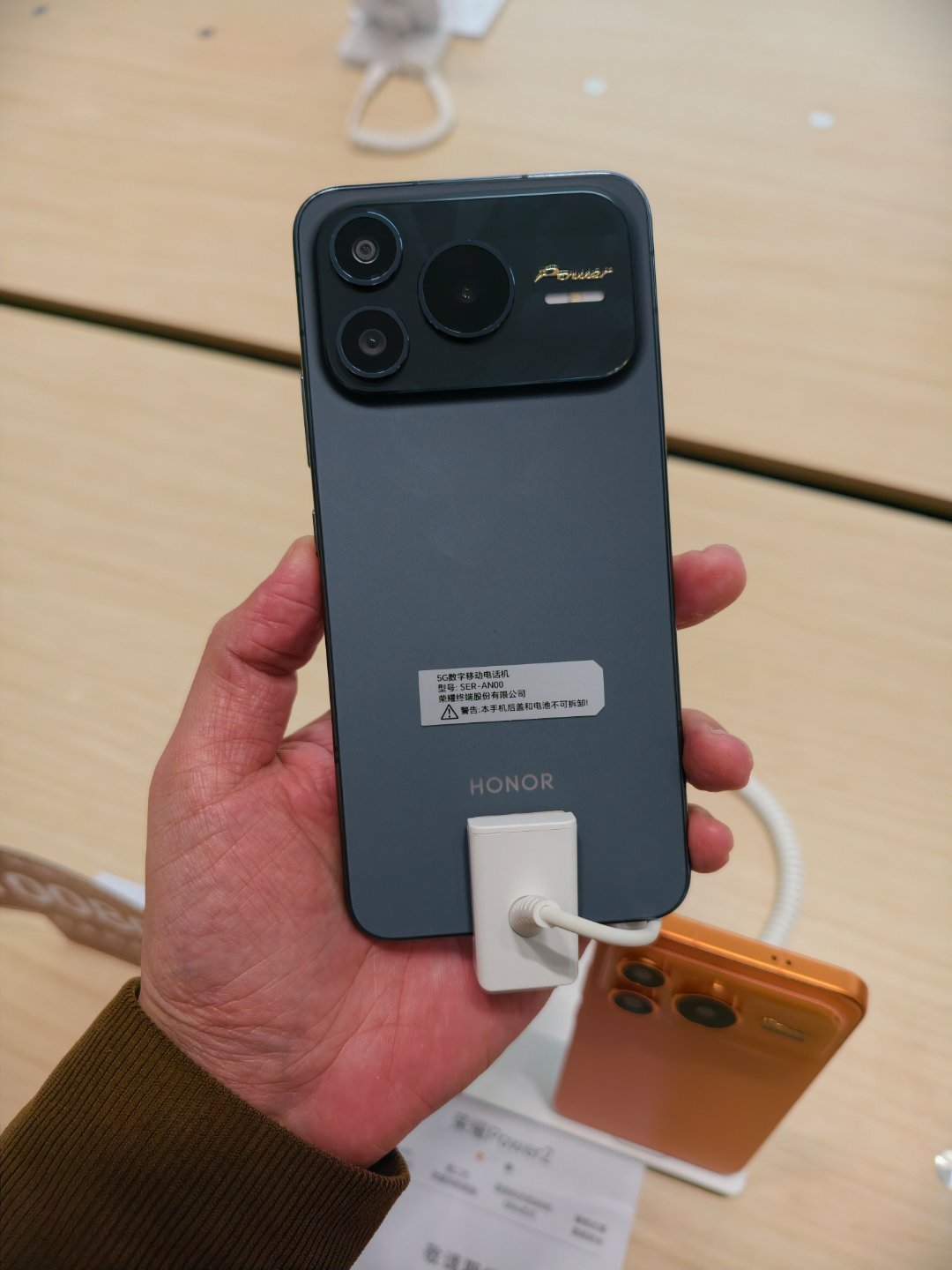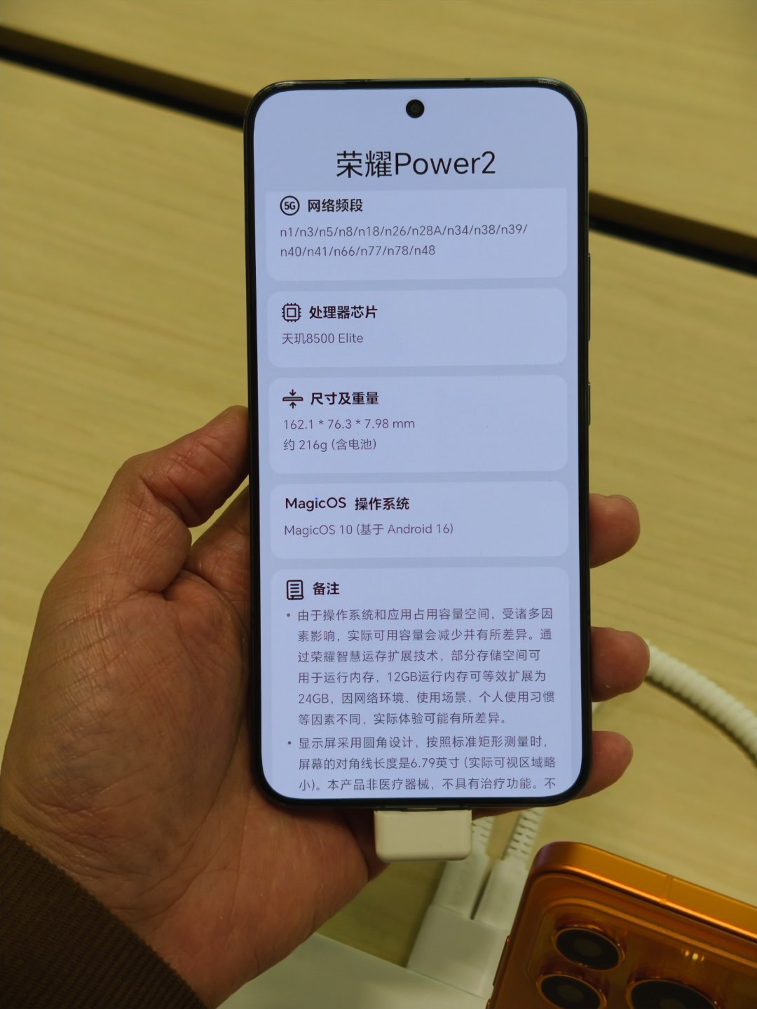 荣耀Power 2这波,档位跑分王。天玑8500 Elite处理器,兔兔跑分240万+,跑分王可不可行?跑分王可不可行不说,电池卷王肯定是没跑了。昨天路过门店,里面已经有展示机了。虽然电池容量破万,不过真机拿起来并不会厚重,甚至还能算薄的,显示厚度7.98mm这个橙色,真的,今年热门词“果味十足”,它也很足。