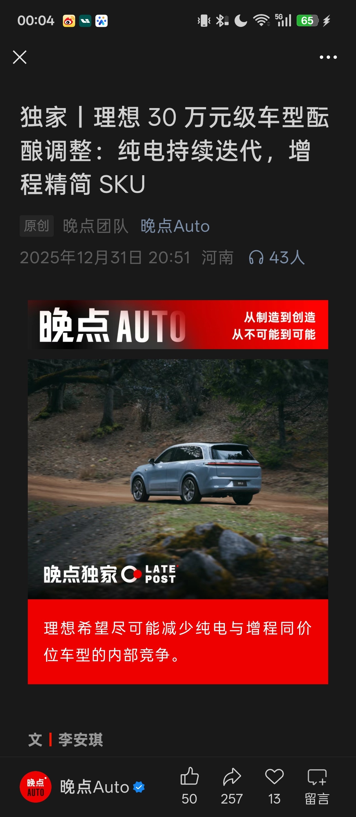 新年快乐,我刚睡醒「晚点」这个是很明确的消息: i8 不会停产;增程方面,将调整 30 万至 40 万元价格段产品,可能还会有一款 50 万元以上的高端车型。算是回应之前那段无聊的「谣言」吧,困难是有的,就是有点落井下石,其实大可不必