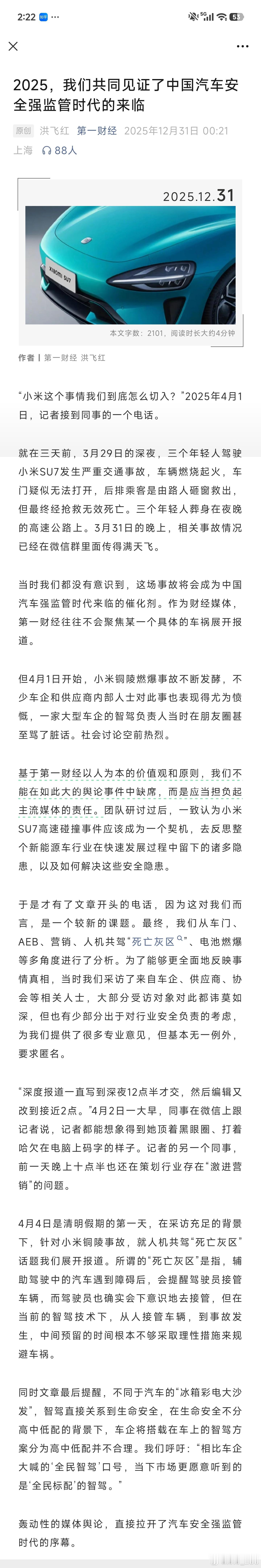 果然,到年底最后一天,第一财经还是没放过小米“当时我们都没有意识到,这场事故将会成为中国汽车强监管时代来临的催化剂。作为财经媒体,第一财经往往不会聚焦某一个具体的车祸展开报道。但4月1日开始,小米铜陵燃爆事故不断发酵,不少车企和供应商内部人士对此事也表现得尤为愤慨,一家大型车企的智驾负责人当时在朋友圈甚至骂了脏话。社会讨论空前热烈。基于第一财经以人为本的价值观和原则,我们不能在如此大的舆论事件中缺席,而是应当担负起主流媒体的责任。团队研讨过后,一致认为小米SU7高速碰撞事件应该成为一个契机,去反思整个新能源车行业在快速发展过程中留下的诸多隐患,以及如何解决这些安全隐患。”