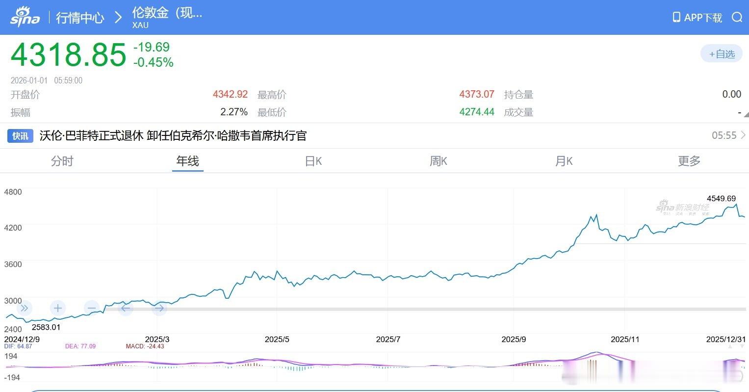 【现货白银2025年涨近150%现货黄金2025年涨超64% 】1月1日,国际金银均创1979年以来最大年度涨幅。COMEX黄金期货跌1.24%,报4332.1美元/盎司,12月累涨超2%,2025年累涨约55%。现货黄金收跌0.46%,12月累涨超2%,2025年累涨超64%。COMEX白银期货跌8.91%,报70.98美元/盎司,12月累涨约28%,2025年累涨超128%。现货白银收跌6%,12月累涨约27%,2025年累涨超147%。现货铂金跌约6%,12月累涨超23%,2025年累涨逾126%。现货钯金微涨,12月累涨超12%,2025年累涨约76%。(财联社)金银均创1979年来最大年度涨幅