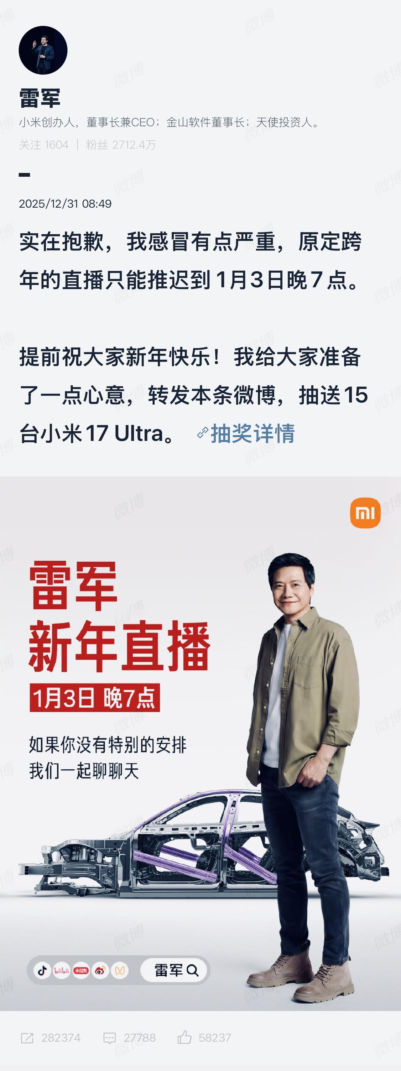 刚才看到一个好朋友在朋友圈的新年寄语:放自己一马。 就想到了雷军昨天这个感冒非常及时,对他好,对小米好,对媒体好,对不少民众也好。 毕竟拆车跨年总觉得哪不好。大家都轻轻松松过完2025最后一天最好。 1月3号,我们再一起看看雷军的小米拆车有什么不同吧。 也期待小米YU9快点来。