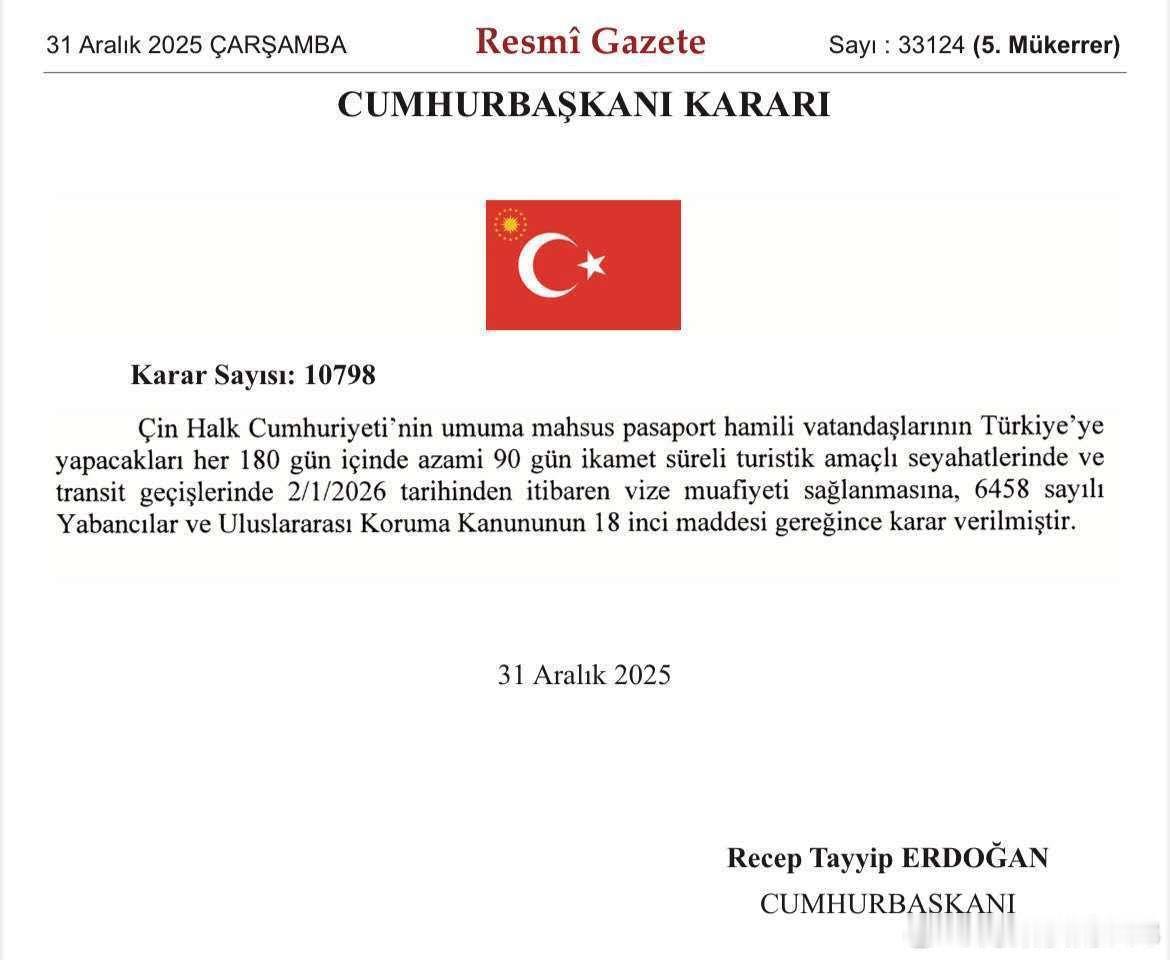 这国宣布,将对持普通护照中国公民免签!------据央视新闻,当地时间2025年12月31日,土耳其《官方公报》发布总统令,宣布自2026年1月2日起,对持中国普通护照的公民实行免签入境政策。根据规定,在每180天内,免签停留时间累计不超过90天,适用于旅游和过境目的。该决定依据土耳其《外国人和国际保护法》第18条作出。 网页链接