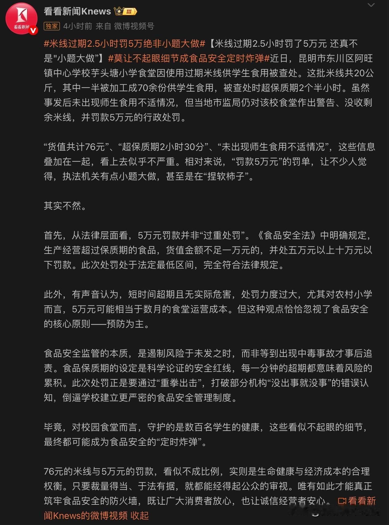 76元的米线过期两个半小时被抓住后罚款5万元,如果你是老板是不是觉得有点想不通?这事儿就发生在云南某镇的一所小学食堂,该食堂当天加工了约10公斤米线,并分给了70多个学生食用,结果被发现该批米线居然已经超过保质期2.5小时,虽然食用者并没出现身体不适现象,但还是被罚款了5万元。起初,当我看到这条新闻时,觉得处罚是不是太严重了,警告一下随便罚款一点不就完了吗?76块钱的东西罚款5万,是不是太严苛了。后来有网友提示说,有的食堂可能会为了节约成本,故意去购买临期食品。于是我恍然大悟,假如真的有部分食堂喜欢购买临期食品,此次不出问题,早晚都要出问题。这种情况一旦出现,那就是大问题。所以,罚款5万合理合法,诚实合法经营才是最节约成本的。