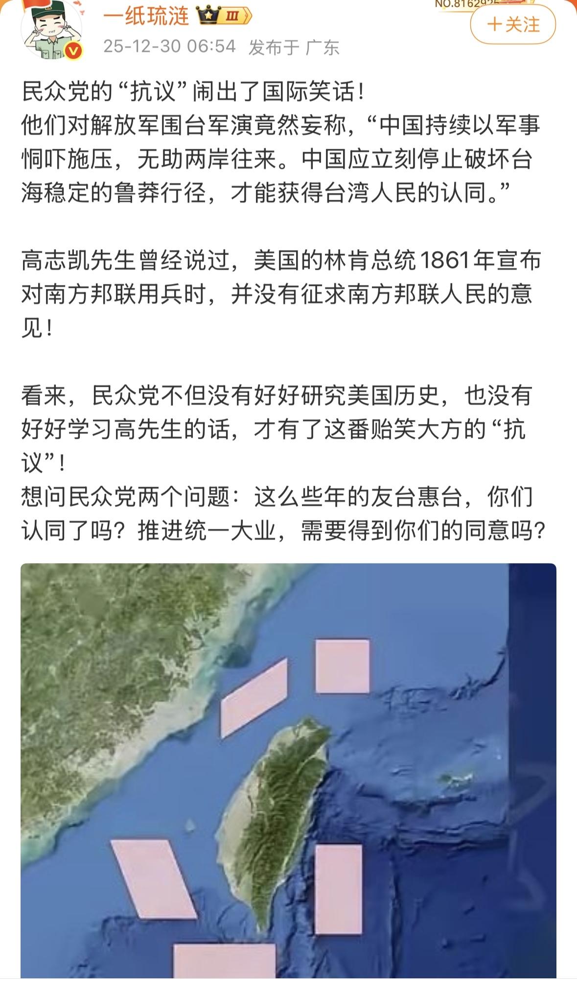 环台军演,蓝白营比绿营海强烈,这一方面反映了蓝白营都担心,另一方面,说明蓝白营对军演的目的还没有清醒认识,希望台湾同胞稍安勿躁,台湾同胞使我骨肉兄弟,我们坚决反对打击“台独”分离势力,绝对保护广大台湾同胞利益和安全!