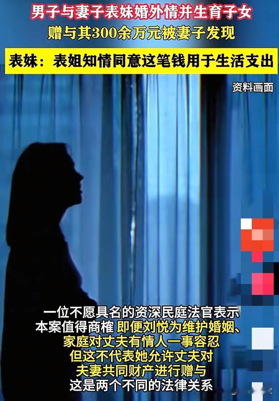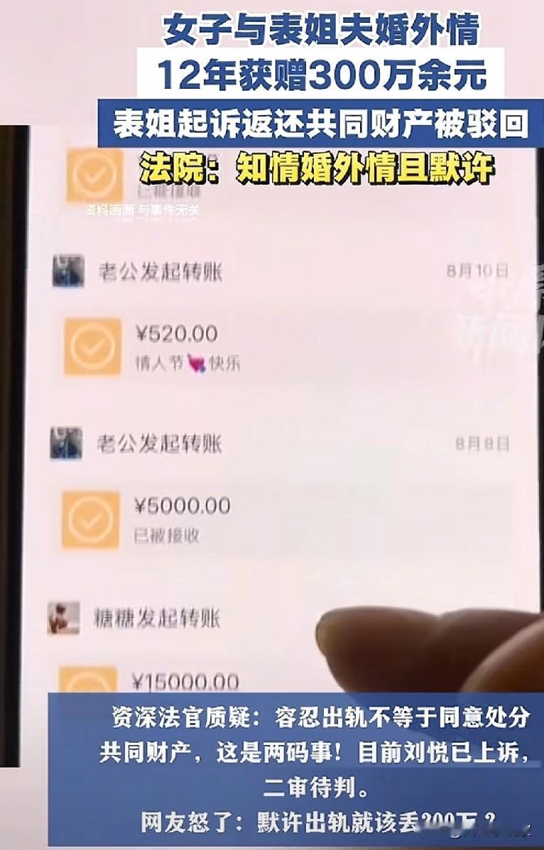 婚姻不是儿戏,且行且珍惜啊。近日重庆一女子起诉第三者追还钱财300万事件以一审败诉,给每一位女性一个警惕。 一原配妻子早年间就已经发现自己的老公和她的表妹有婚外情,多年阻拦和规劝也无济于事,直到两个人在外生育了子女,原配妻子终于醒悟。2022年她无奈选择离婚,后又因顾及儿女原谅了丈夫。 可就在离婚后她才发现,十几年间,出轨的丈夫背着她转账给表妹有300万左右的金额,更是气愤的是,手机记录满屏都是520,1314甚至几千上万的转账凭证。这不是赔了夫人又折兵吗,于是她立马提起诉讼,起诉身为第三者的表妹归还夫妻共同财产。 可没想到重庆的法院,以她早已知晓婚外情并默认,离婚时已就财产分割达成一致为由,驳回了她的全部诉求。且转账期间,老公和表妹都说原配妻子是知情的。女子表示不服,于2025年12月再次提起上诉,二审还未判定。 这件事最让人争议的是,知道对方出轨,不代表就同意他把几百万送给第三者吧?这是两码事。容忍婚外情,很多时候是为了孩子、为了家庭,是无奈的选择,不能直接推导出,“你同意他拿钱去养小三啊?” 这起案子争议很大,所以劝女人们,遇到背叛,离婚前想清楚,不要一时冲动啊,就像这个案件,一旦离婚追诉的钱财就很麻烦了。大家觉得这笔钱能不能追讨回来,一方面离婚了,但是转账期间又是在婚内,应该算是夫妻财产吧。