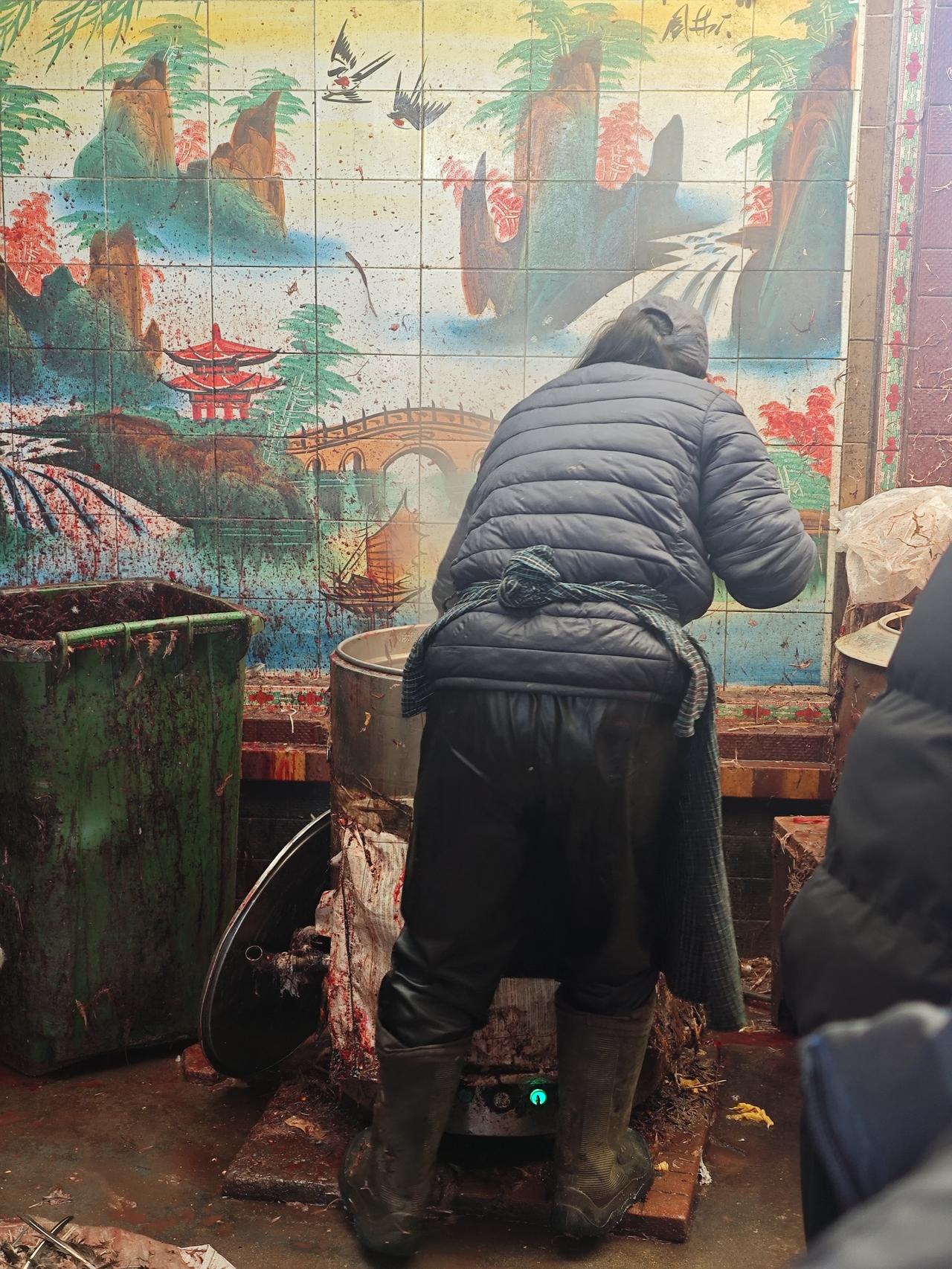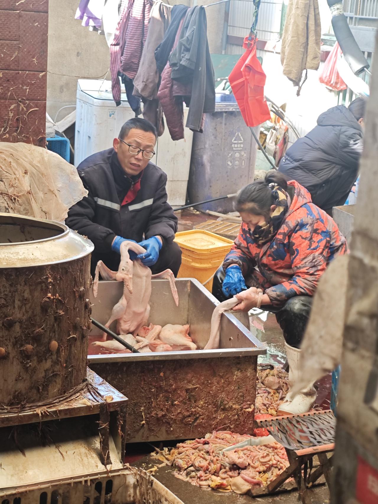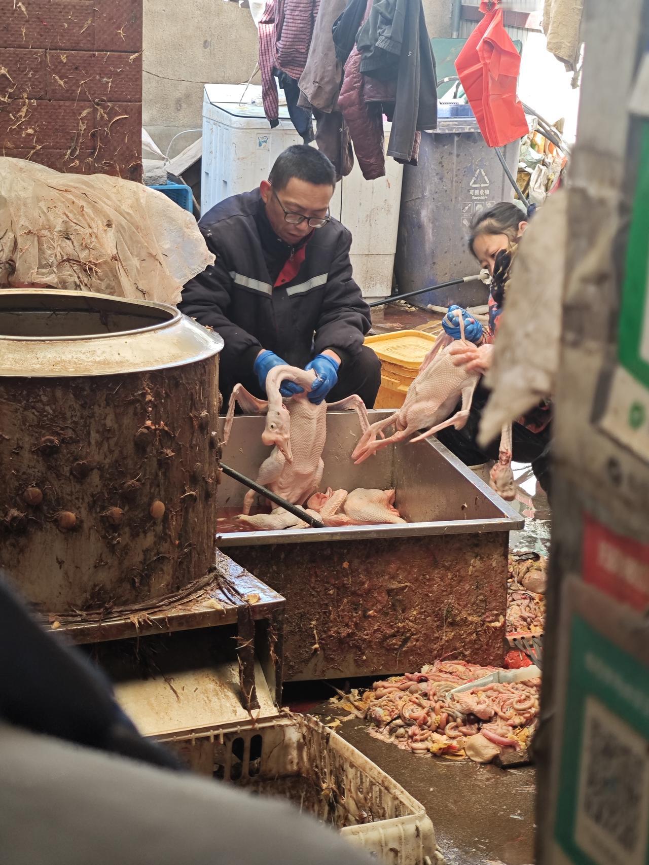 昨天不是回村里了嘛,二姨家给了一只鸡,我公公不敢杀鸡,今天来镇上了一家杀鸡的人家,那是年根底下的村口,老李家的杀鸡摊。 瓷砖墙面上的山水画被溅得星星点点的红,倒像是给那亭台楼阁添了簇腊月的红梅。老李媳妇裹着厚墩墩的羽绒服,背对着人忙活,胶皮围裙系得严实,深筒雨靴踩在混着血水和鸡毛的水泥地上,蹭出咯吱的声响。铁笼歪歪扭扭靠在墙边,里头的鸡鸭早被挑拣得差不多,只剩几只空笼晃着,笼沿挂着片被扯落的羽毛。 一旁的大铁桶腾腾冒着热气,老李蹲在不锈钢水槽边,手上的蓝手套浸得湿漉漉的,正麻利地给鸭子褪毛。指节用力,鸭掌在他手里翻个身,沾着的细毛就被捋得干干净净。地上的红塑料筐里堆着鸡杂,扫到一边的鸡毛铺了薄薄一层,风一吹,轻飘飘地打个旋,又落在那幅花里胡哨的瓷砖画下。 来杀鸡的都是村里的熟面孔,拎着自家养的鸡鸭,在摊边唠着嗑。“老李,今个儿手速够快啊,明儿我家那只大公鸡还得劳烦你。”有人喊着,老李头也不抬,应了句“妥了,明儿早点来”,手上的动作却没停。 腊月的风刮在脸上凉飕飕的,可这杀鸡摊前的热气和喧闹,倒把年的味道烘得浓酽。红的血、白的水汽、乱飞的鸡毛,还有人们嘴里念叨的年货、年饭,揉在一块儿,就是最接地气的年景。等傍晚收摊时,瓷砖墙上的红渍会被水冲淡,地上的鸡毛也会被扫走,可这年根下的烟火气,早飘进了村里家家户户的窗棂里。 你们那有杀鸡的地方吗? 农村杀鸡 杀鸡法 农村杀年鸡