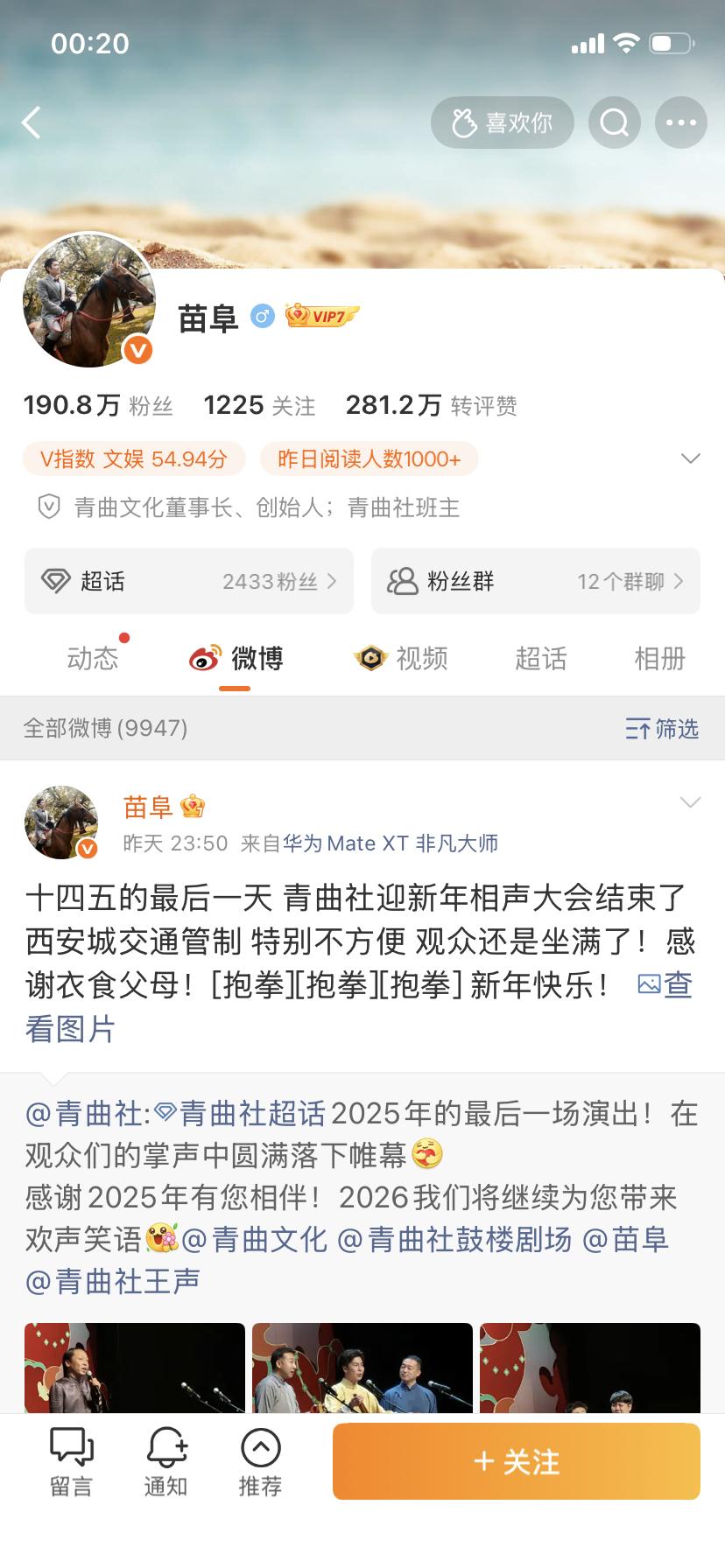 【著名相声演员苗阜晒出跨年演出现场,德云社之下第一人,你怎么看?】 12月31日