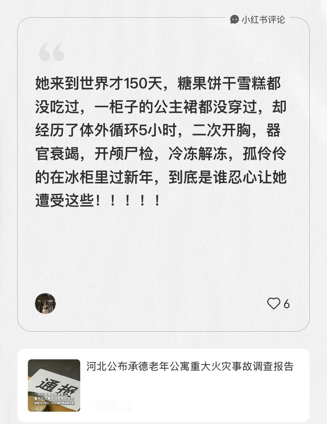 我在潇湘晨报的笔记[笔记]下发布了一条评论 她来到世界才150天,糖果饼干雪糕都没吃过,一柜子的公主裙都没穿过,却经历了体外循环5小时,二次开胸,器官衰竭,开颅尸检,冷冻解冻,孤伶伶的在冰柜里过新年,到底是谁忍心让她遭受这些!!!!!