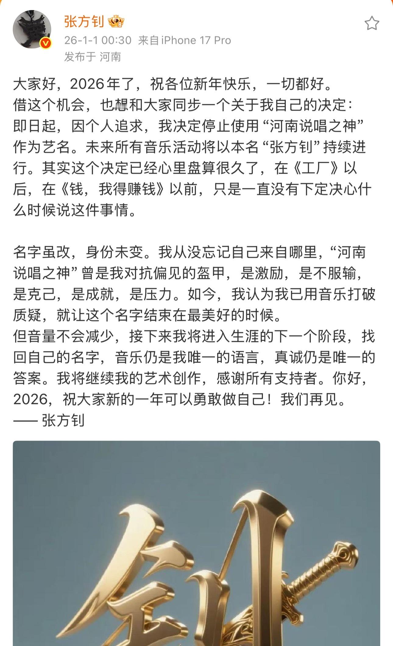 河南说唱之神宣布停用河南说唱之神这个名字!以后以本名张方钊活动!“名字虽改,身份未变。我从没忘记自己来自哪里,“河南说唱之神”曾是我对抗偏见的盔甲,是激励,是不服输,是克己,是成就,是压力。如今,我认为我已用音乐打破质疑,就让这个名字结束在最美好的时候。但音量不会减少,接下来我将进入生涯的下一个阶段,找回自己的名字”河南说唱之神