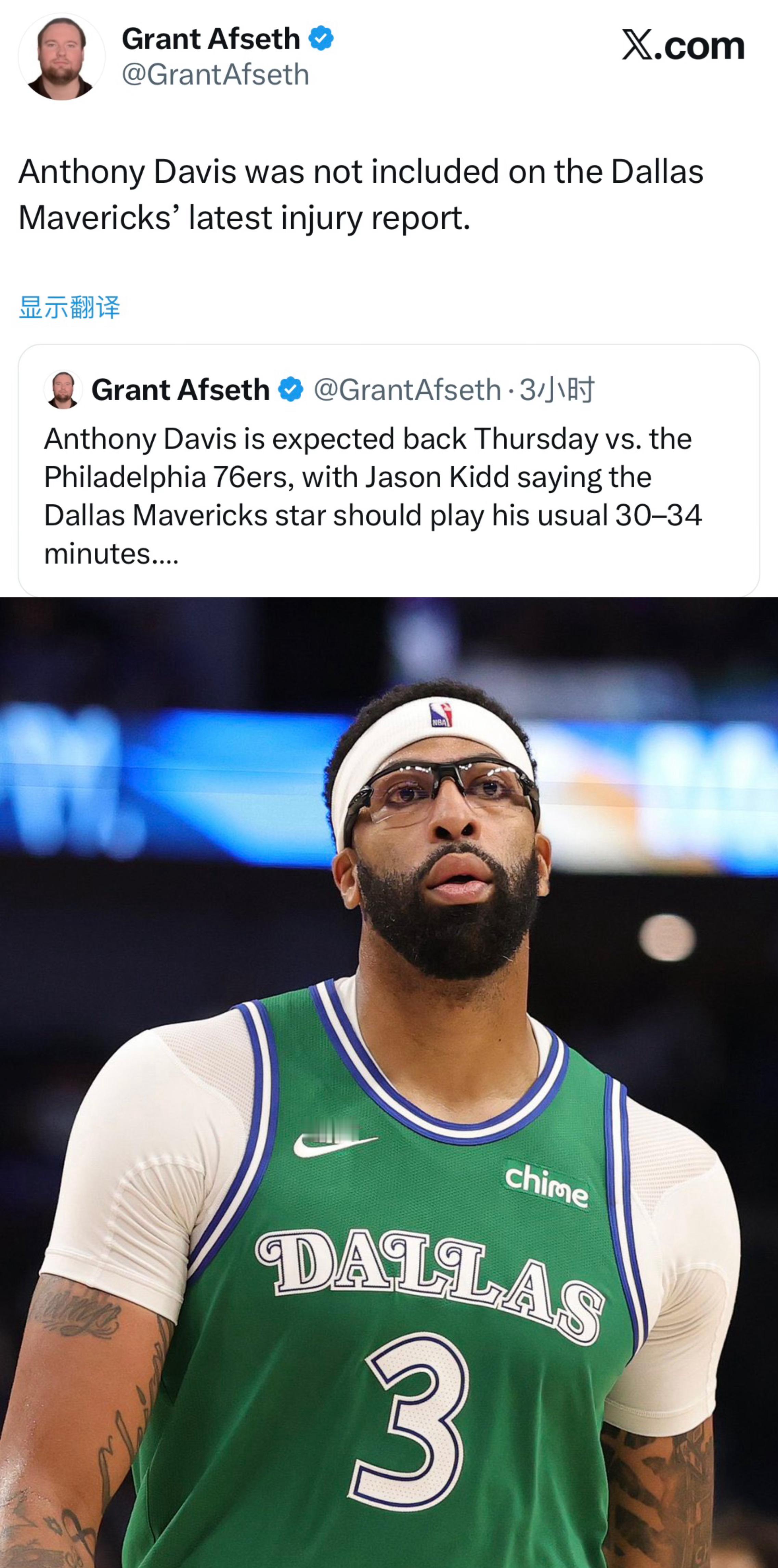 浓眉不在独行侠伤病报告中,预计出战明天与76人的比赛。