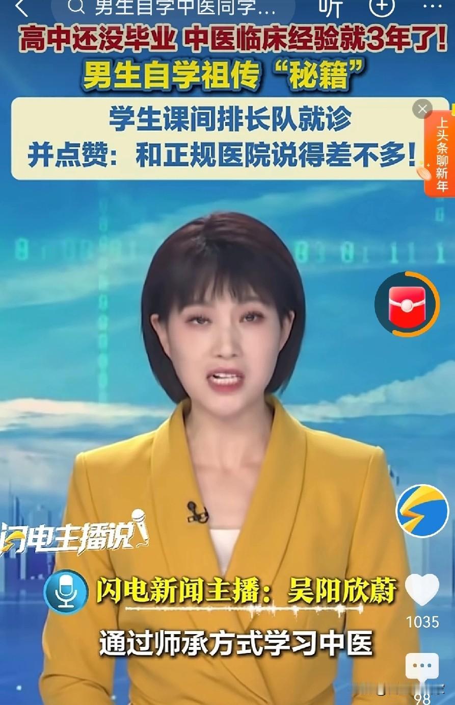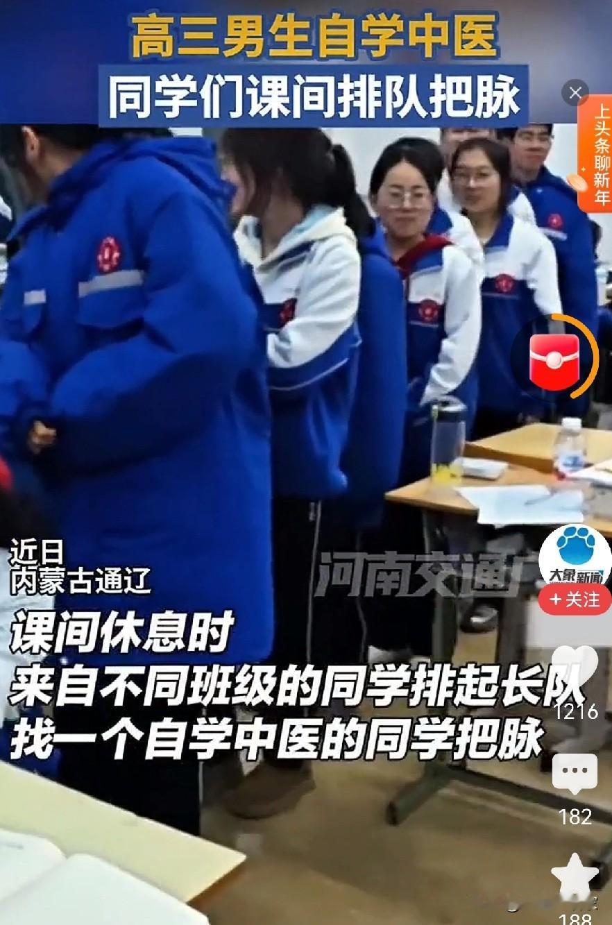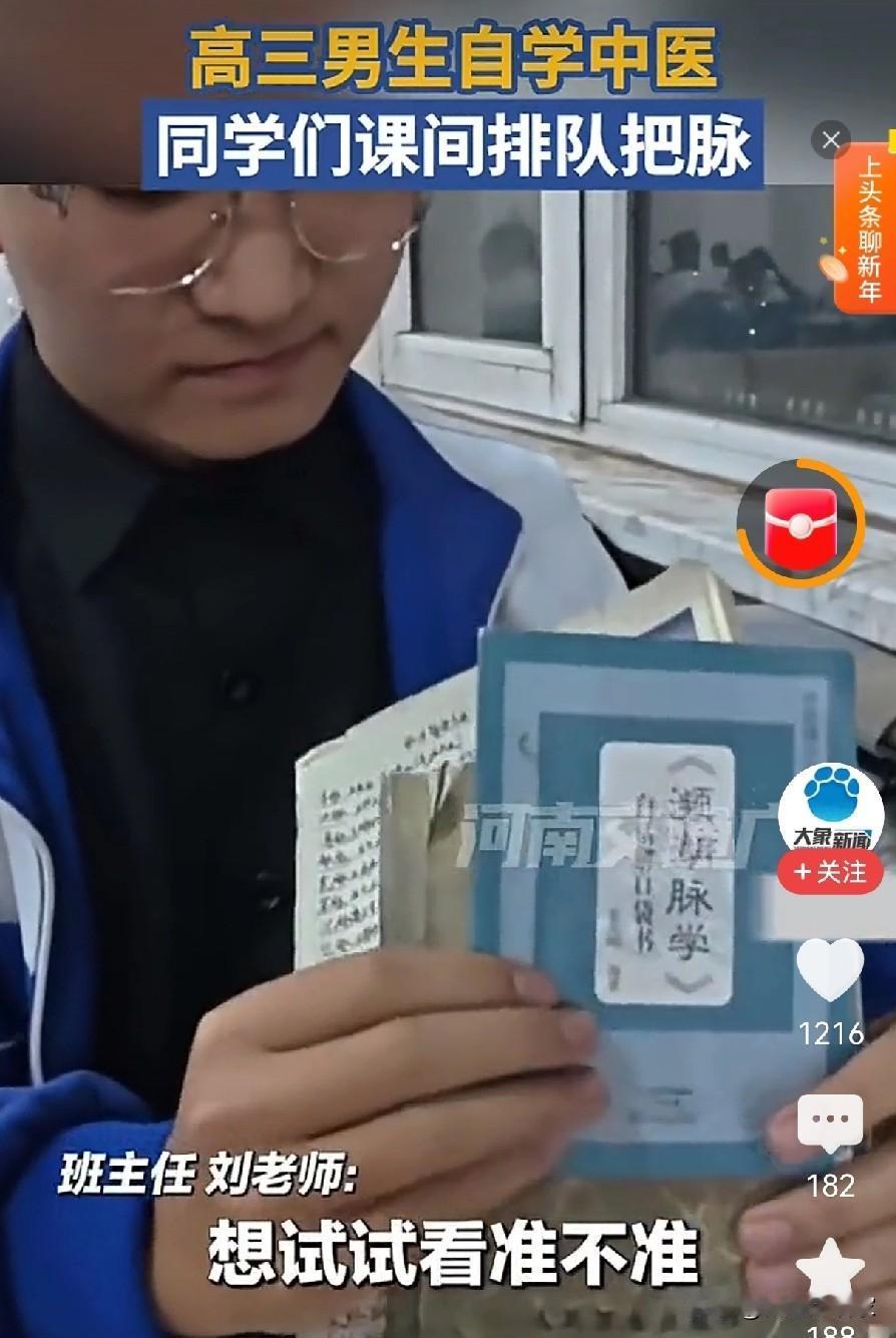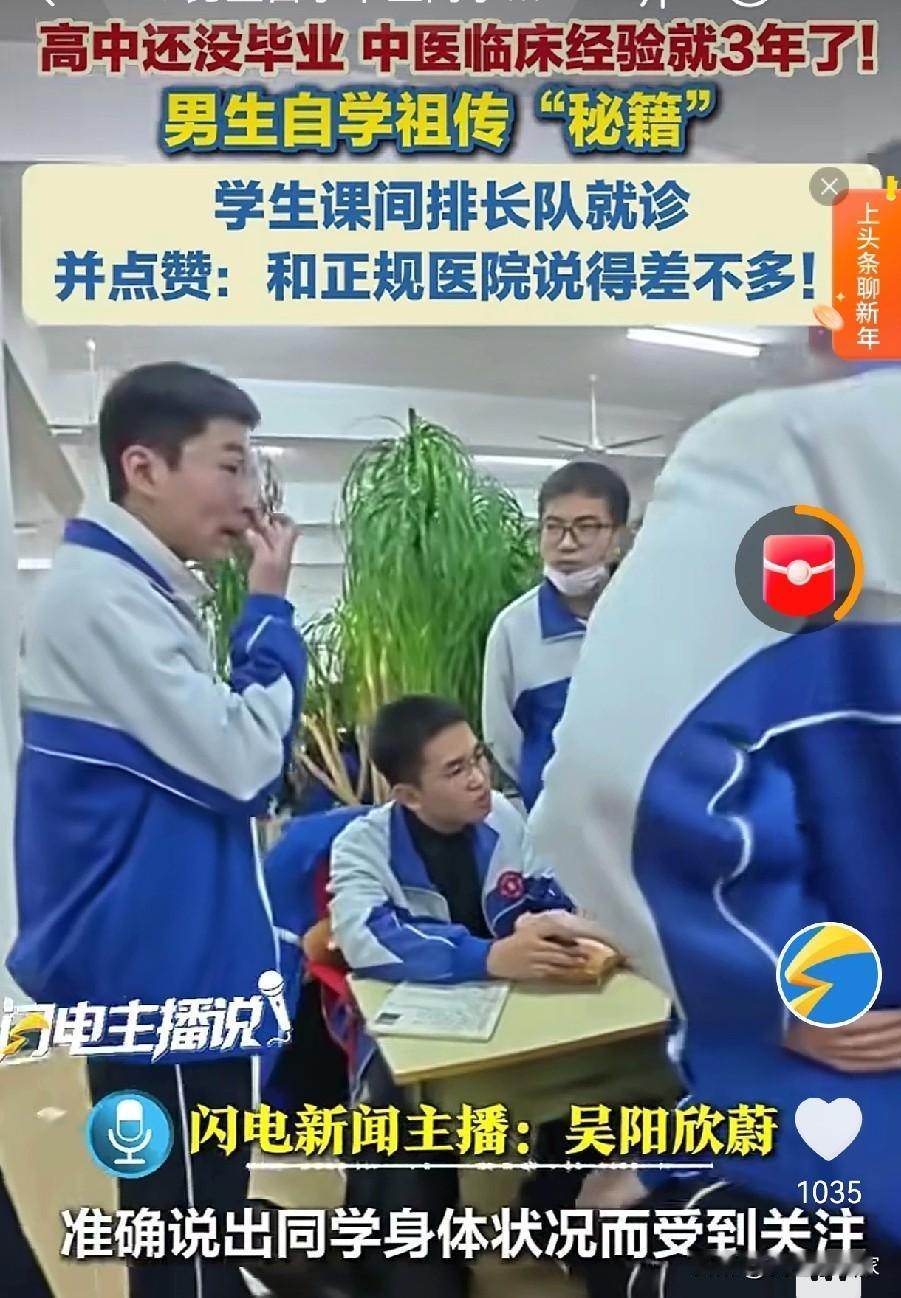 “高中还没毕业,中医的临床经验就有三年”。大家可别笑,这可是真事且家有祖传“秘籍”的医学书,纯纯的师承中医啊。 这是内蒙古一高三男生,自幼就看家里留下来的中医古书,走红的起因,是一次课间的时候,为一个同学号脉,立刻确切无误的就说出了同学的身状况,一时间走红了全校。 起初老师都不相信,直到看到课间时排起的长长队伍,甚至很多同学都说,该同学“诊断”的结果和医院医生说的几乎一样。 要知道,中医讲究“望闻问切”,更讲究经验沉淀。这位男生没有科班院校的加持,靠的就是祖传古籍的滋养和日复一日的摸索实践。三年的临床经验,不是坐在诊室里熬出来的,是在校园的课间十分钟里,在同学们的信任和好奇里,一点点积累起来的。 有人说,少年强则国强,这小伙子就是最好的例子。也有人担心,他毕竟没受过系统的专业训练,这样“坐诊”会不会有风险? 大家怎么看待这位高三男生的中医之路?是觉得天赋异禀值得点赞,还是认为应该先完成学业再深耕专业呢?