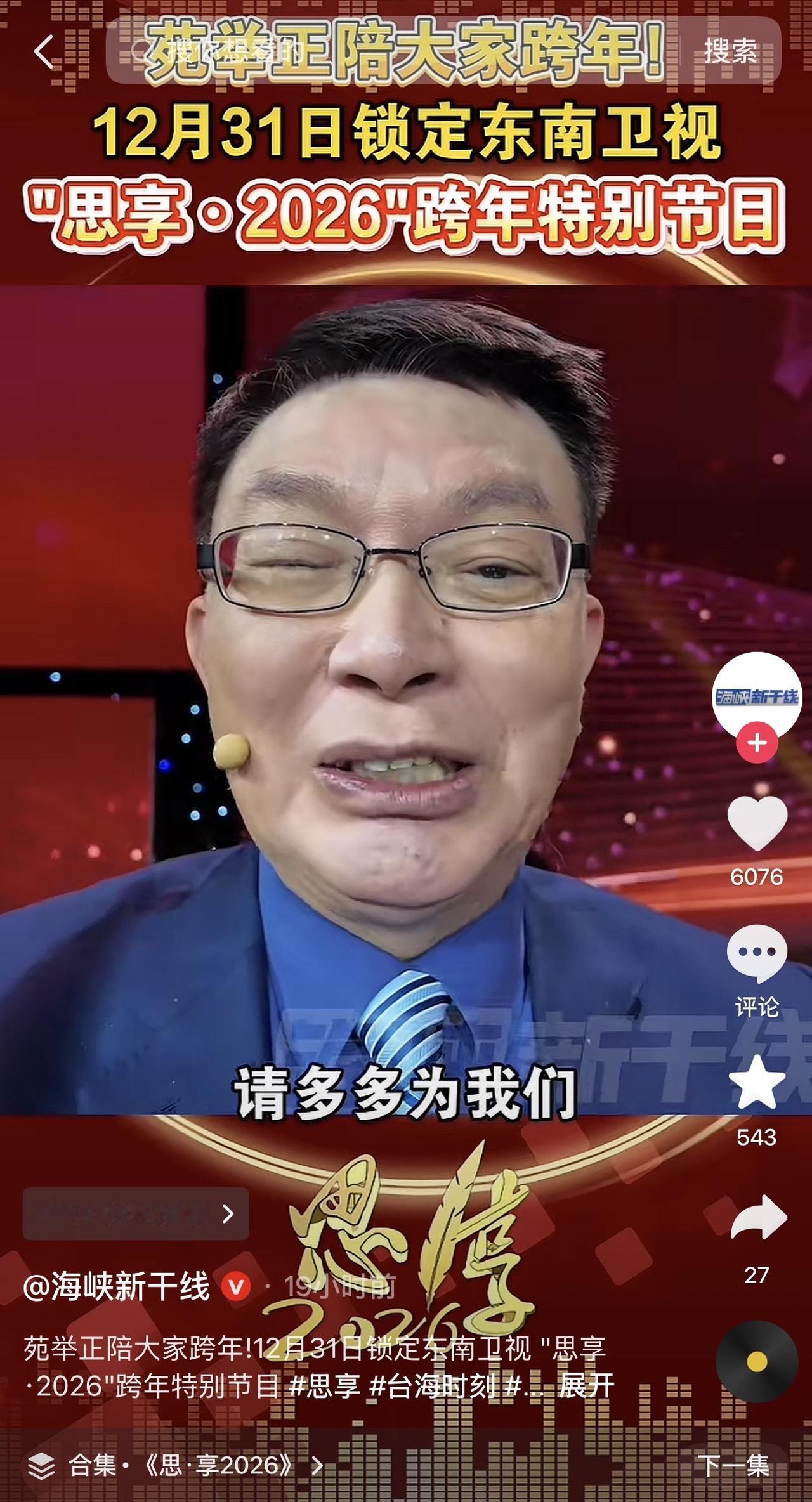 2025年——2026年跨年,苑举正和邱毅两位教授参加了东南卫视的跨年特别节目《思享•2026》 节目中苑举正教授激动说:我卑微的恳请大陆救救台湾同胞!赖清德一个选票不足三成的人,却企图带着全台湾人一起完蛋!你不觉得很悲哀吗?你不觉得很难过吗?你不觉得台湾人需要被解救吗?! 说实话真的,台湾也就只有这一代人还有这样有家国情怀的统派人士了,哪怕在学校教书要被绿蛙恶意写检举信,哪怕再多困难!依旧不忘赤子之心!收复台湾也就趁现在吧!因为这样的人在台湾越来越少了,而且年纪都大了! 就连蔡正元博士也要被关押了!所以再不行动,以后更难了! 怎么就走到了这一步,一群只为私利的政客就这么带着台湾民众到了万丈深渊!怎么就会有人不惜一切代价要做个傀儡呢!是不是傻!青鸟,黑熊都已经妖魔化了!都愁人![捂脸][捂脸][捂脸]苑举正
