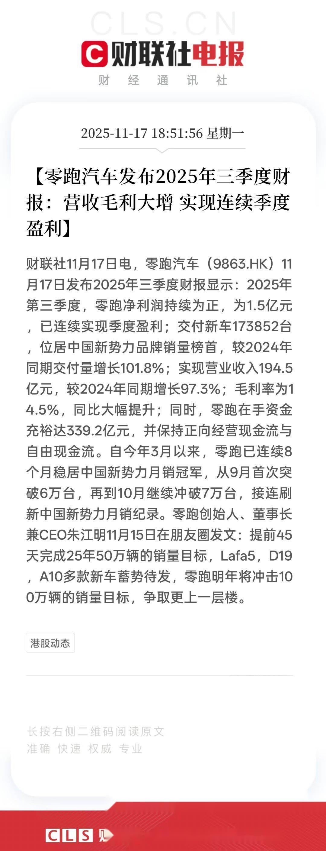 要说这零跑最近真是好事一件接着一件,刚刚开完了10周年发布会,带来了两款全新旗舰车型D19、D99。这1月份刚开始,零跑就宣布12月交付60423台,连续十个月稳居新势力第一的同时,也创造了近60万台的新势力交付纪录。其实这样的成绩在三季度财报发布后,就已经有不少媒体预测到了,这原因就在于零跑不仅交付量上去了,而且在整体公司经营方面也连续刷新了单季度交付、营收,甚至是盈利方面的品牌纪录,并成为了蔚小理零四大头部新势力中,唯一三季度盈利(1.5亿元)的品牌。而且我发现,现在零跑不光是卖得好,更是把“好而不贵”的策略延续到了高端市场。就说D19这台车吧,除了展示颜值上的精益求精,它在十周大会上的内饰发布也引起了市场热议。既有能媲百万豪车的辊边工艺等细节,也有算力高达1280TOPS的双8797中央域控,更完成千伏纯电、增程CTC技首发,每一处都是百万级技术加持,2026年冲百万交付、保持连续盈利,难吗?零跑汽车 造车新势力 零跑D19