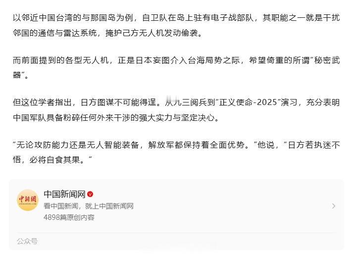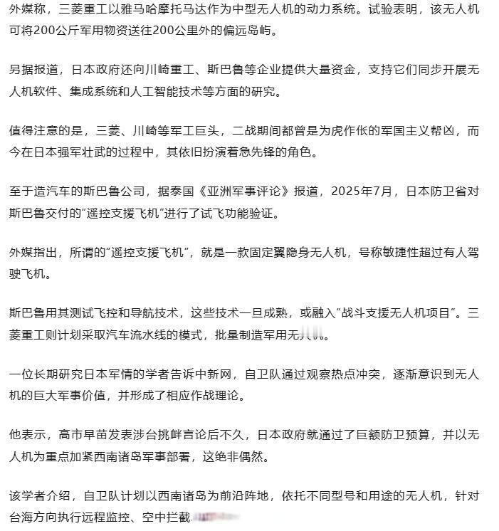 【专家称日本加紧对台海无人机作战部署】 三菱川崎又成日本扩军备战急先锋 据报道,日本2026财年防卫预算超9万亿日元,其中很大一部分资金计划用于采购数千架无人机,强化所谓“多层海岸攻防体系”。预算还列支专项经费测试美制无人机,并资助三菱重工、川崎重工等军工巨头研发隐身作战无人机。这些企业在二战时充当军国主义帮凶,如今又成为日本扩军备战的急先锋。防务学者告诉中新网,日本以西南诸岛为前沿,加紧针对台海的无人机作战部署,其干预意图昭然若揭。他同时指出,中国军队完全有能力、有决心粉碎任何外来干涉,日方若执迷不悟,必将自食其果。(钟新军)