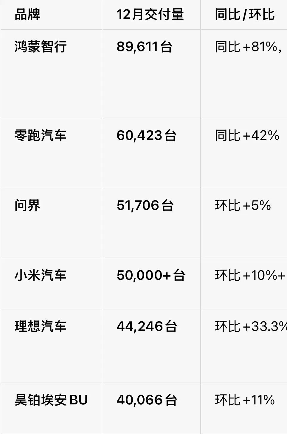 小米汽车12月交付量超5万台 2025年12月交付量突破5万台!也是其历史首次达成单月5万台交付成就。2025年11月,小米汽车就已提前完成全年交付35万台的目标。同事,雷军官宣了新的购车活动——小米YU7全系推出3年0息购车活动,“首付7.49万,月供可低至4961元”多家车企公布2025全年成绩单