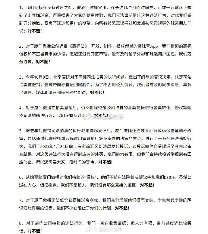 从懂球帝的道歉信中可以看出,言语之间很不情愿。去年懂球帝商标拍卖,直播吧中标后,创始人陈聪的在没有证据的情况下讲出这样的言语,确实让人吃惊。如今法院给出了最终判定,要求赔钱+道歉。 懂球帝侵犯直播吧名誉权被判赔偿