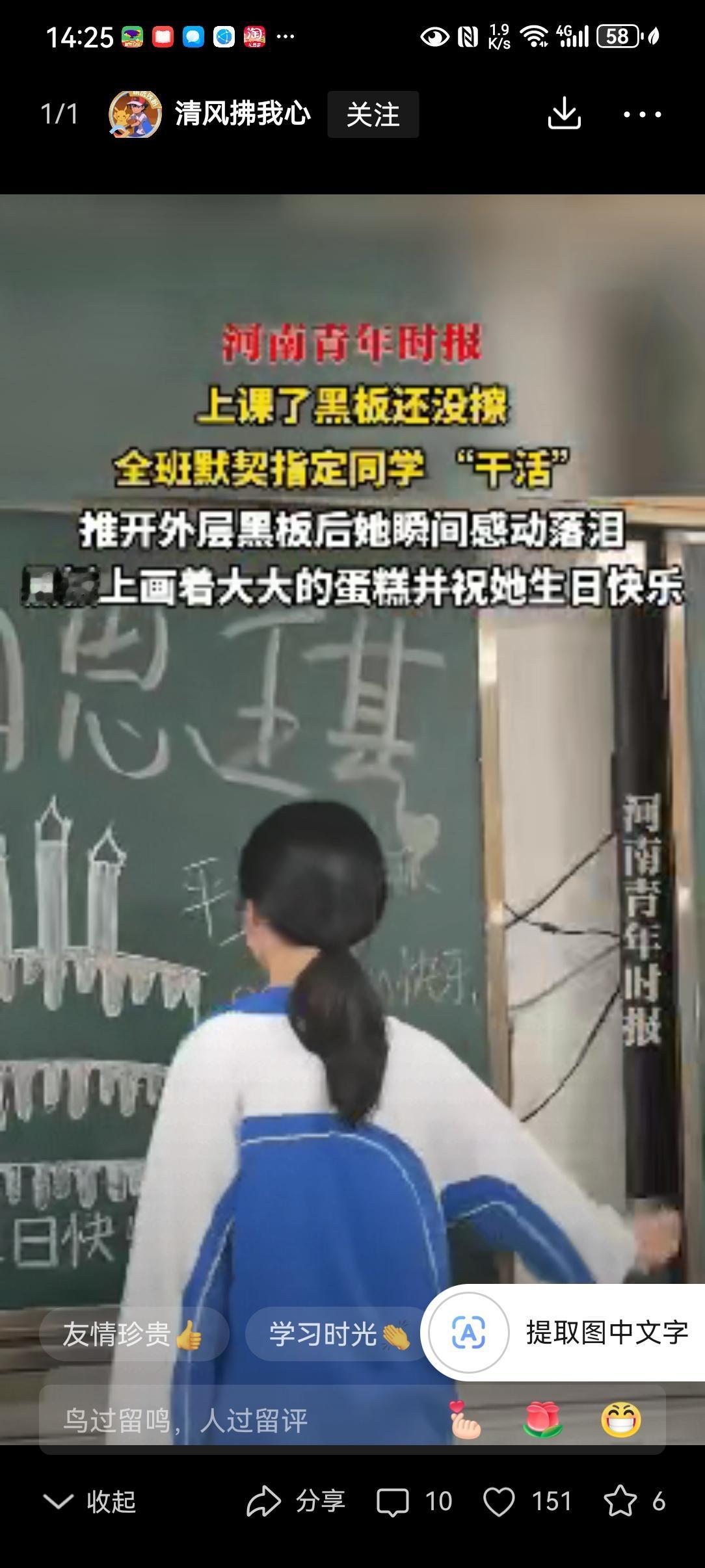 太暖心了!近日广东东莞,老师上课时发现黑板还没擦便问今天谁值日,没想到同学们竟异口同声的报出了女生的名字,女生看着周围起哄的同学非常气愤的上前擦黑板,没想到擦完后之后泪目了,原来同学们不是欺负她,而是为了给她惊喜。 广东东莞的教室里,老师扫了眼没擦的黑板,问了句谁是值日生。 话音刚落,满教室的声音竟齐刷刷指向同一个女生。 女生愣了愣,她明明不是今天的值日生。 想开口解释,可起哄的声音一阵盖过一阵,把她的话堵在了喉咙里。 一股气涌上来,她红着脸,憋着委屈,快步走到黑板前擦了起来。 她实在想不通,平日里相处和睦的同学,怎会突然集体“欺负”自己。 擦完一块黑板,她刚要转身,同学们又齐声喊住了她。 “还有另一块!” 女生强压着情绪,伸手拉开了黑板。 下一秒,她整个人都僵住了。 另一块黑板上,画着歪歪扭扭的生日蛋糕,旁边写满了稚嫩却真诚的祝福。 原来,这天是她的十七岁生日。 同学们早就和老师商量好,要给她一个最特别的惊喜。 那声齐声声的点名,不是欺负,而是奔赴惊喜的序章。 女生的眼眶瞬间红了,她蹲下身,把脸埋进胳膊里,不想让大家看见自己的眼泪。 几个要好的女同学立刻围过来,轻轻扶起她,替她擦去眼角的泪水,给了她一个紧紧的拥抱。 教室里,不知是谁起了个头,大家齐声唱起了生日快乐歌。 歌声不算整齐,甚至还有人跑调,却比任何华丽的乐章都要动人。 老师将这一幕拍下来发到网上,瞬间戳中了无数网友的泪点。 有人说,开头还以为是校园霸凌,看到最后才发现是少年人的浪漫。 也有人感慨,能在学生时代遇到这样一群同学,是一辈子的幸运。 还有人直言,这才是孩子的世界该有的样子,纯粹又温暖。 这份惊喜,没有昂贵的礼物,没有盛大的排场,却有着最珍贵的心意。 少年人的情谊,大抵就是这样。 不掺任何杂质,用自己独有的方式,把温柔和善意,悄悄送给身边的人。 多年以后,女生或许会忘掉课本里的公式定理,却一定忘不了这堂语文课上,同学们用黑板写下的祝福,和那首跑调的生日歌。 这份少年时代的温柔,会在漫长的岁月里,一直温暖着她。