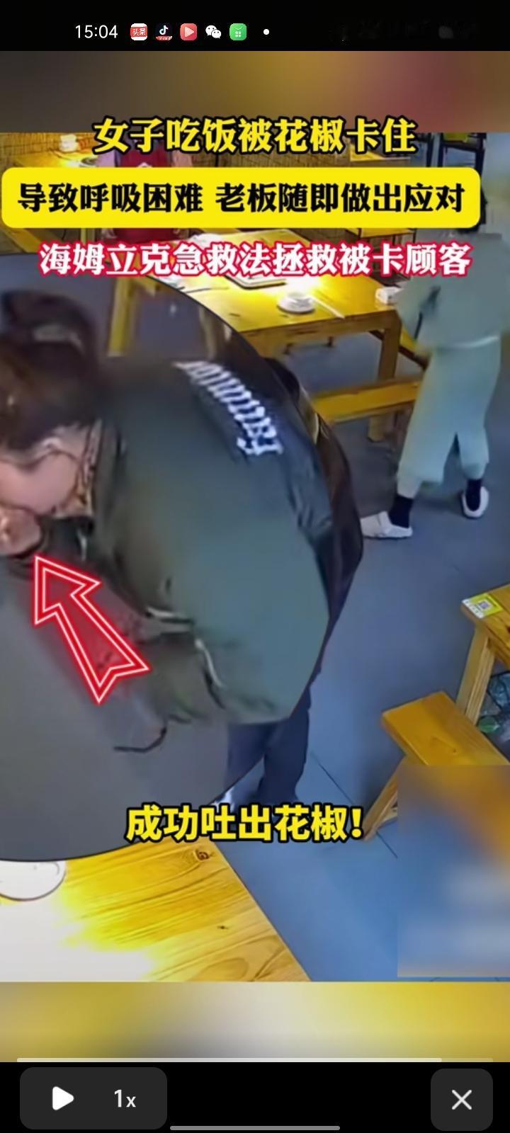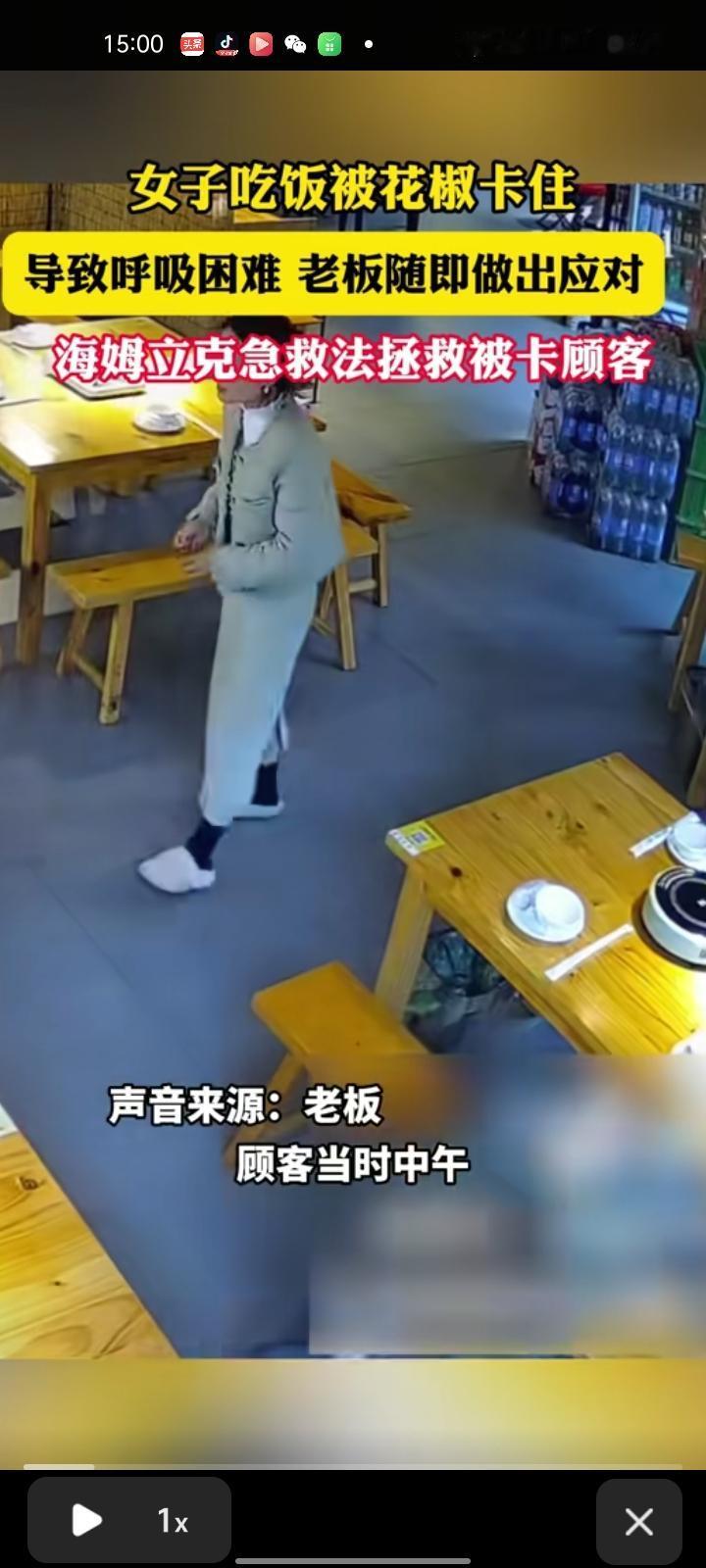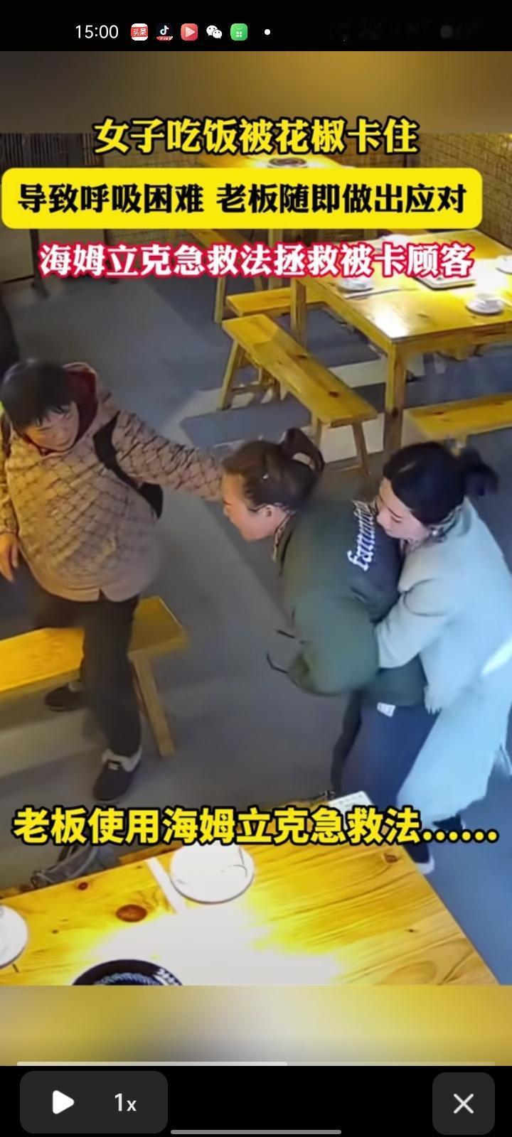12月30日,湖北宜昌。女顾客和朋友吃饭时花椒被卡住,脸色通红呼吸困难,老板娘随即做出应对,用海姆立克法拯救被卡顾客,最终成功吐出花椒