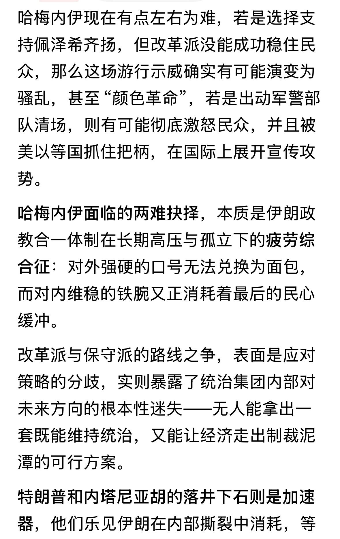 高层必然内斗,高层不内斗,就不可能一夜变天,美国以色列也不是落井下石,这分明是火上浇油,不火上浇油,也不可能一夜变天!看吧,伊朗局势这几年一直不稳定,抗议示威时有发生,说是一夜变天,但是冰冻三尺夜,非一日之寒。#伊朗#