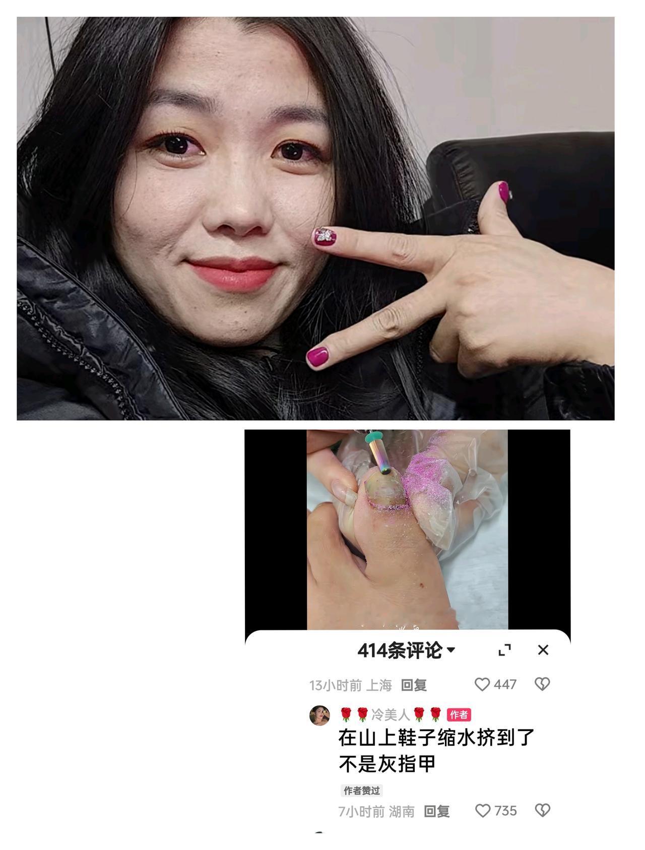 元旦第一天,冷美人发黑发紫的脚指甲震惊了大家的眼球。 这一天冷美人美美的分享,元旦自己去接了睫毛做了美甲。 美甲的时候还特意给自己的脚趾甲一个大镜头,一个发黑发紫的脚趾甲。大家都以为是灰指甲,没想到冷美人回复说是在荒野求生的时候鞋子泡了水挤的。 这一瞬间立刻让大家回忆起前不久荒野求生那个又冷又饿的时候。 冷美人真的是太不容易了,当初在生理期的时候依然坚持比赛。 虽然后来冷美人因为隐瞒有老公的原因,导致大家对她不那么看好了,也挡不住冷美人现在已经风生水起坐拥几十万粉丝了。
