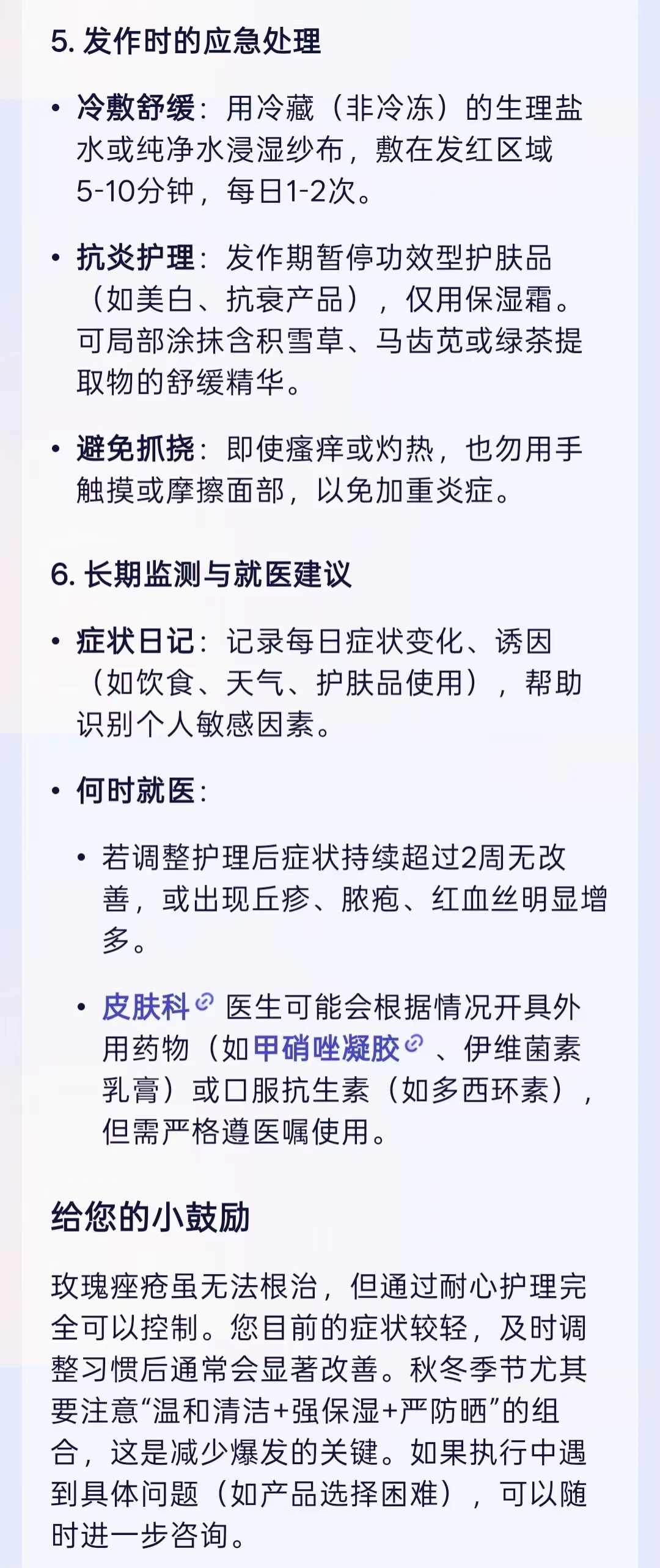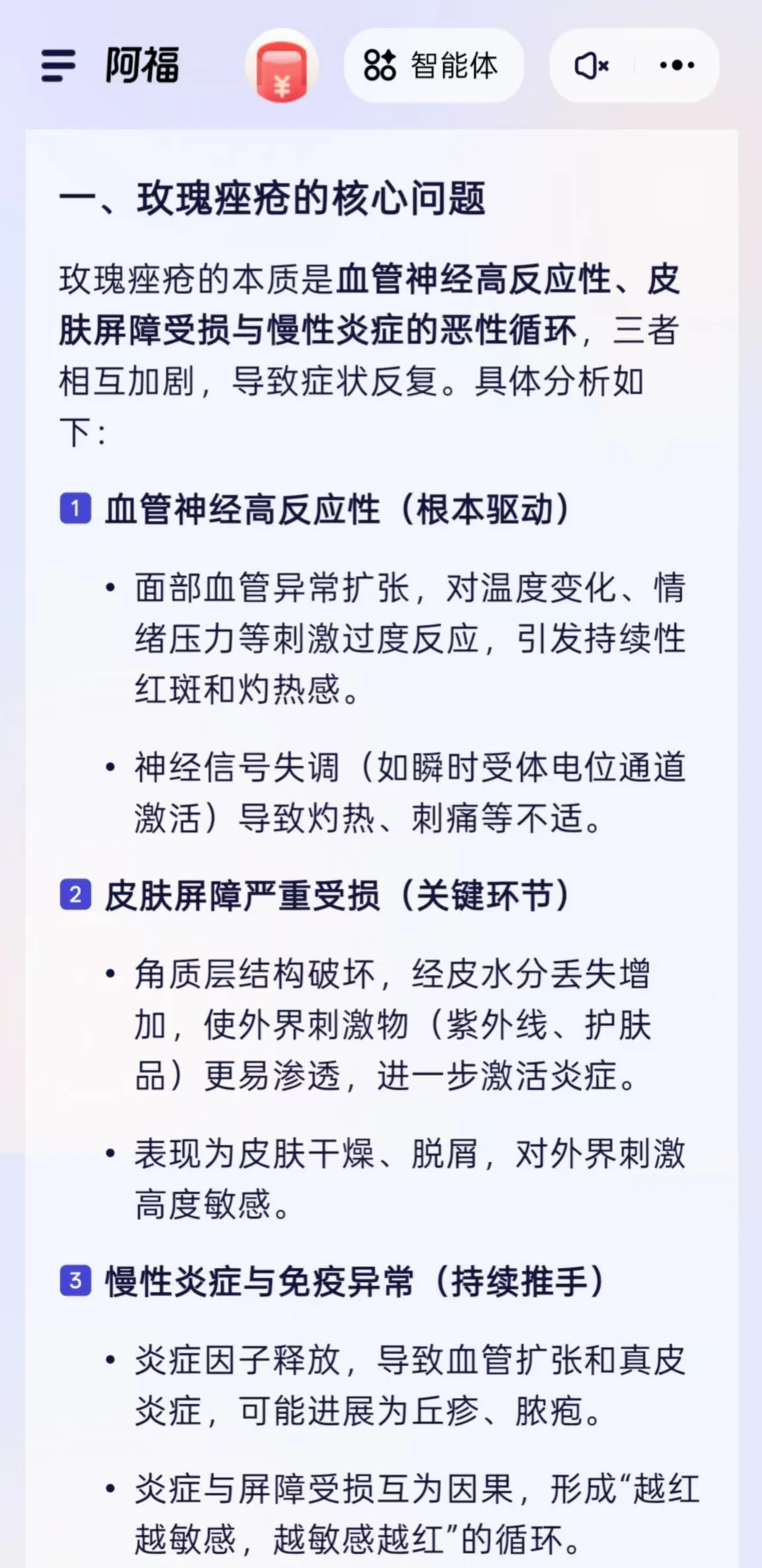 现在我不仅用阿福查玫瑰痤疮的护理知识,还会上传皮肤状态照片让它解读,有疑问直接问健康问答板块,结合最新医学文献的回答特别专业。另外也能通过它快速挂号公立医院皮肤科,一条龙服务太省心~如果你也在为玫瑰痤疮困扰,真的可以试试用阿福先自查一下,它专业的追问和解读能帮你避坑不少。