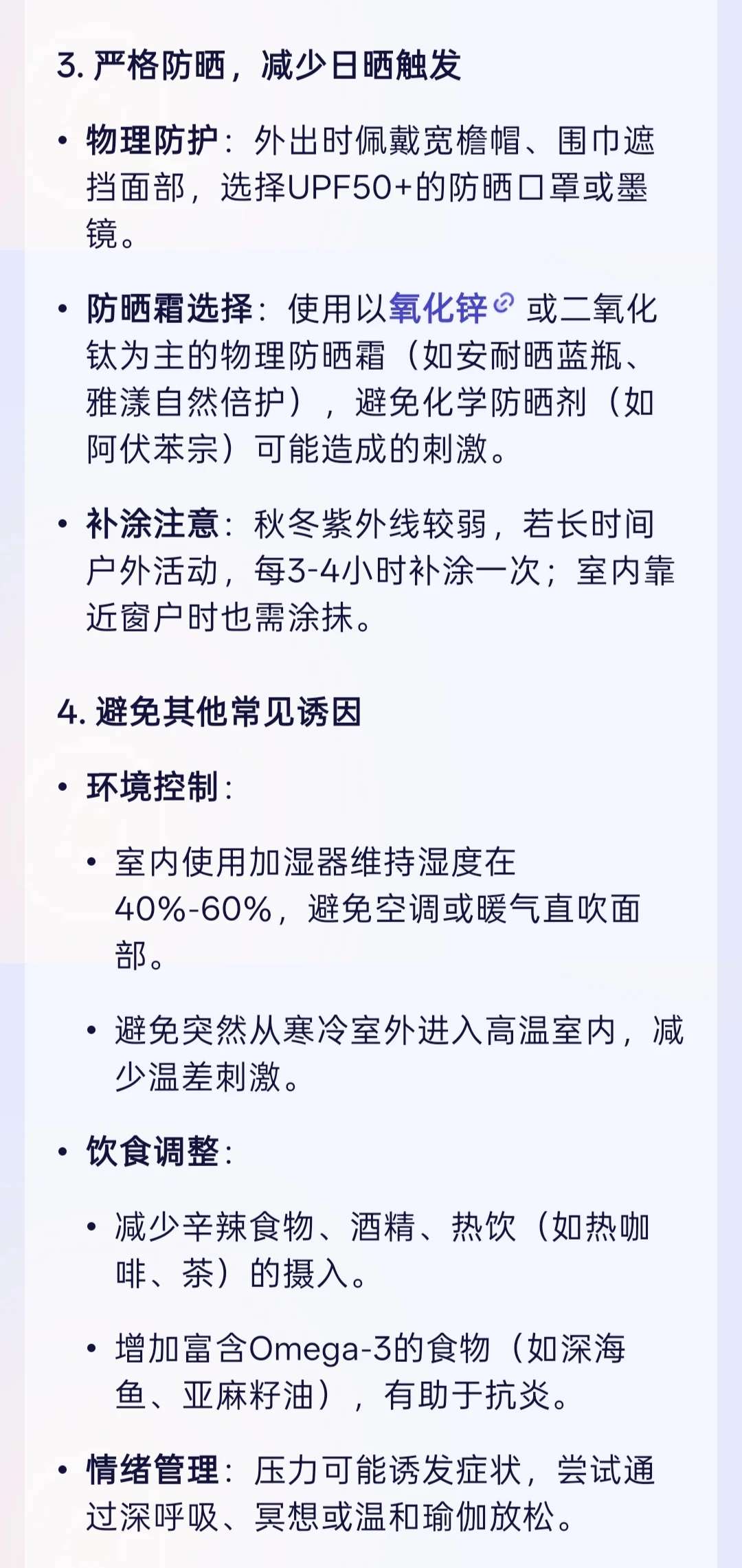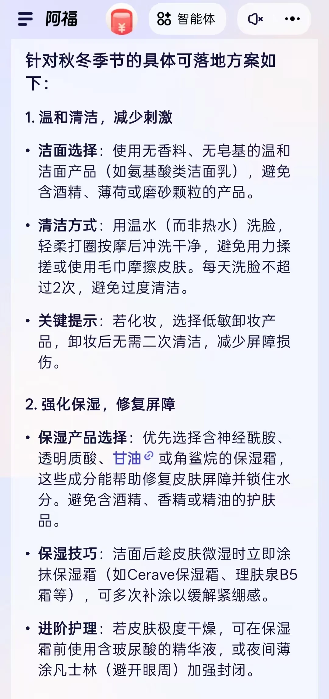 它推荐的秋冬养护方法也超靠谱!清洁要选无皂基的氨基酸洁面,用温水轻柔洗,每天不超过 2 次;保湿要选含神经酰胺、透明质酸的产品,洁面后趁皮肤微湿赶紧涂,我按这个方法做,干燥紧绷感明显缓解。阿福还提醒我秋冬也要严格防晒,优先选物理防晒 + 氧化锌类物理防晒霜,避开温差刺激,这些都是我之前没注意到的点。