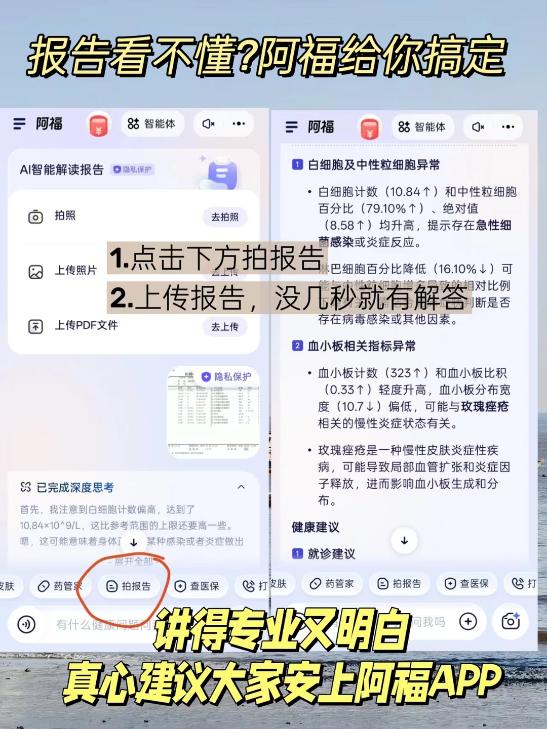 根据阿福给的建议,我去看了大白,拿到报告看不懂,就上传到阿福【拍报告】功能,太香了!不明白的指标,,掰碎了给你讲清楚,再也不用在网上傻傻找解说,还越看越慌。